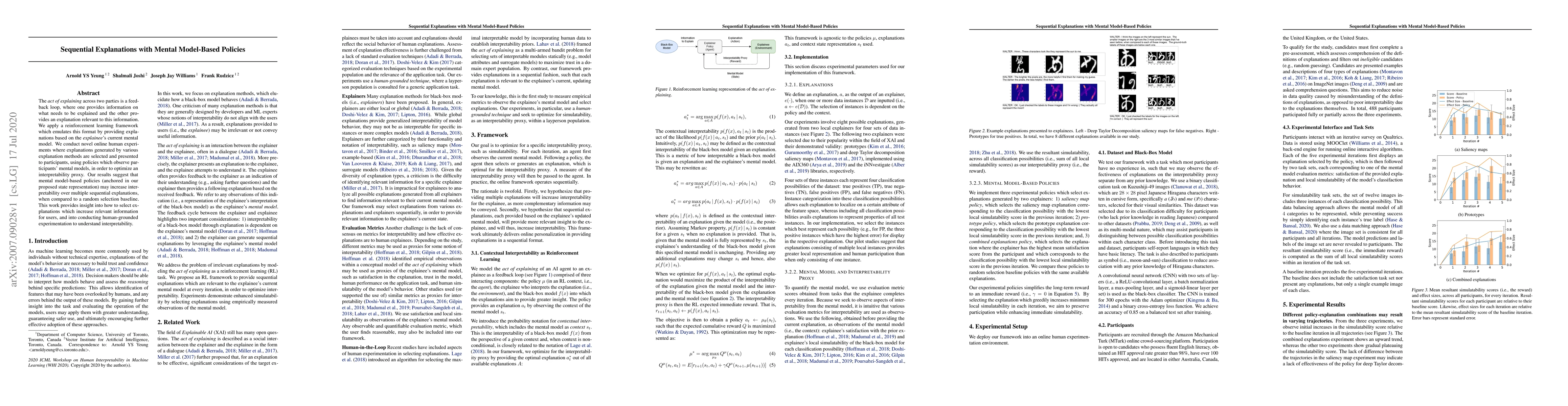 The act of explaining across two parties is a feedback loop, where one provides information on what needs to be explained and the other provides an explanation relevant to this information. We apply a reinforcement learning framework which emulates this format by providing explanations based on the explainee's current mental model. We conduct novel online human experiments where explanations generated by various explanation methods are selected and presented to participants, using policies which observe participants' mental models, in order to optimize an interpretability proxy. Our results suggest that mental model-based policies (anchored in our proposed state representation) may increase interpretability over multiple sequential explanations, when compared to a random selection baseline. This work provides insight into how to select explanations which increase relevant information for users, and into conducting human-grounded experimentation to understand interpretability.