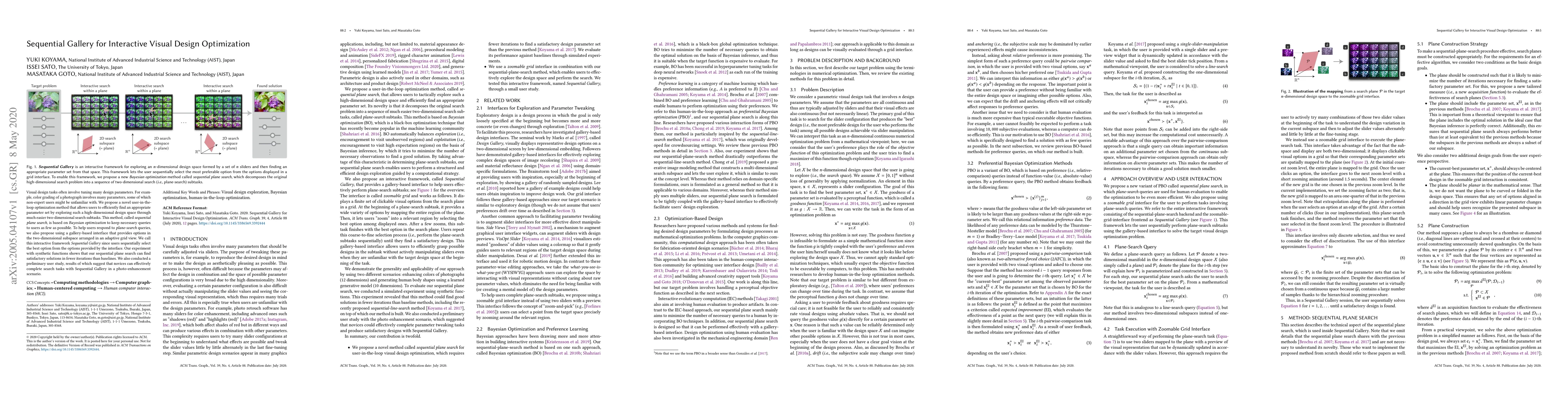 This paper introduces a novel optimization method called sequential plane search, which uses Bayesian optimization and a gallery-based interface to help non-expert users efficiently navigate high-dimensional visual design spaces. Preliminary experiments and user studies indicate that this approach can find satisfactory solutions faster than baseline methods and is effective for novice users in photo-enhancement tasks.