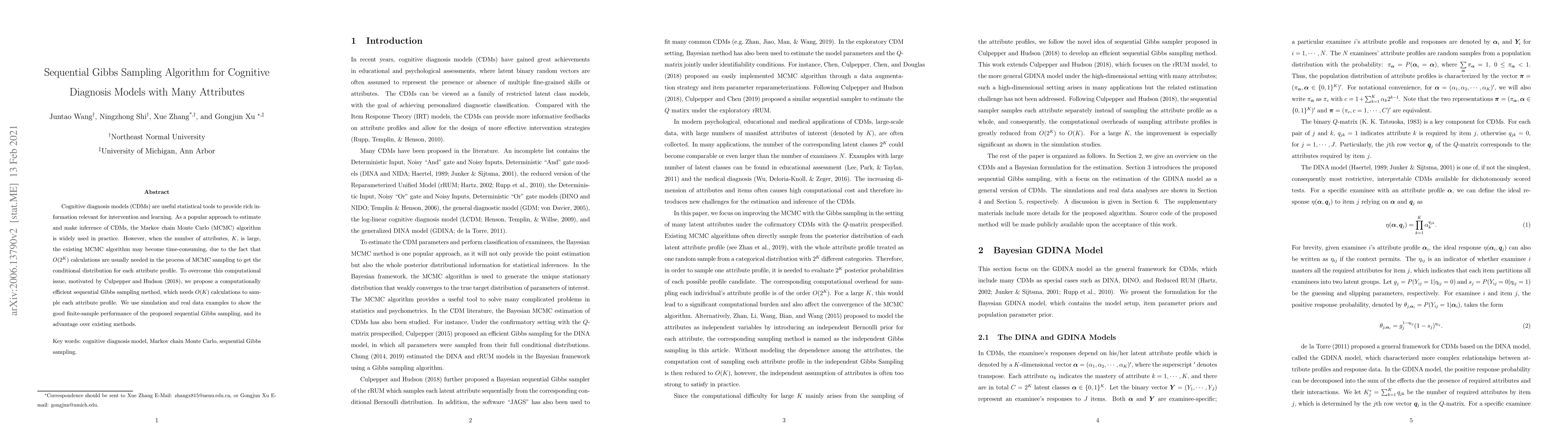 Cognitive diagnosis models (CDMs) are useful statistical tools to provide rich information relevant for intervention and learning. As a popular approach to estimate and make inference of CDMs, the Markov chain Monte Carlo (MCMC) algorithm is widely used in practice. However, when the number of attributes, $K$, is large, the existing MCMC algorithm may become time-consuming, due to the fact that $O(2^K)$ calculations are usually needed in the process of MCMC sampling to get the conditional distribution for each attribute profile. To overcome this computational issue, motivated by Culpepper and Hudson (2018), we propose a computationally efficient sequential Gibbs sampling method, which needs $O(K)$ calculations to sample each attribute profile. We use simulation and real data examples to show the good finite-sample performance of the proposed sequential Gibbs sampling, and its advantage over existing methods.