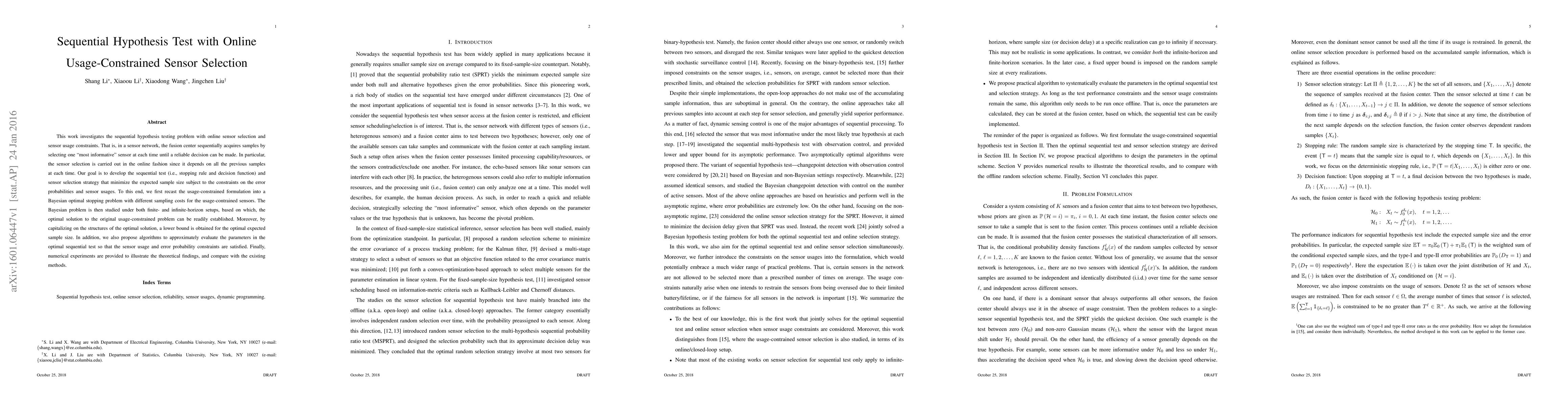 This paper develops a sequential hypothesis testing method with online sensor selection and usage constraints in sensor networks, aiming to minimize the expected sample size while maintaining error probabilities and sensor usage limits. It recasts the problem into a Bayesian optimal stopping framework and proposes algorithms to evaluate parameters to meet the constraints, followed by numerical experiments to validate the approach.