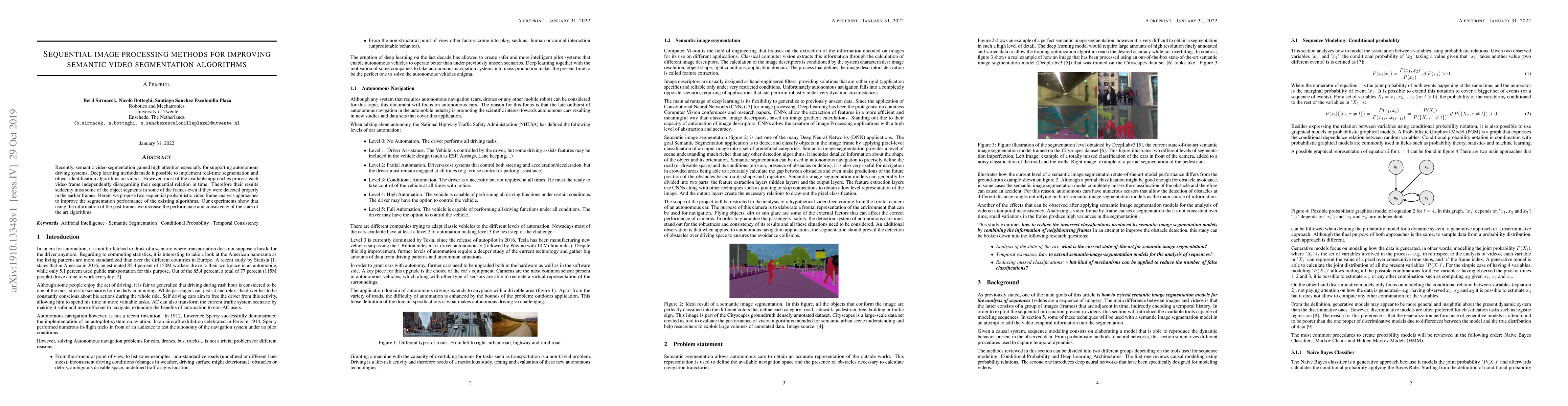 Recently, semantic video segmentation gained high attention especially for supporting autonomous driving systems. Deep learning methods made it possible to implement real time segmentation and object identification algorithms on videos. However, most of the available approaches process each video frame independently disregarding their sequential relation in time. Therefore their results suddenly miss some of the object segments in some of the frames even if they were detected properly in the earlier frames. Herein we propose two sequential probabilistic video frame analysis approaches to improve the segmentation performance of the existing algorithms. Our experiments show that using the information of the past frames we increase the performance and consistency of the state of the art algorithms.