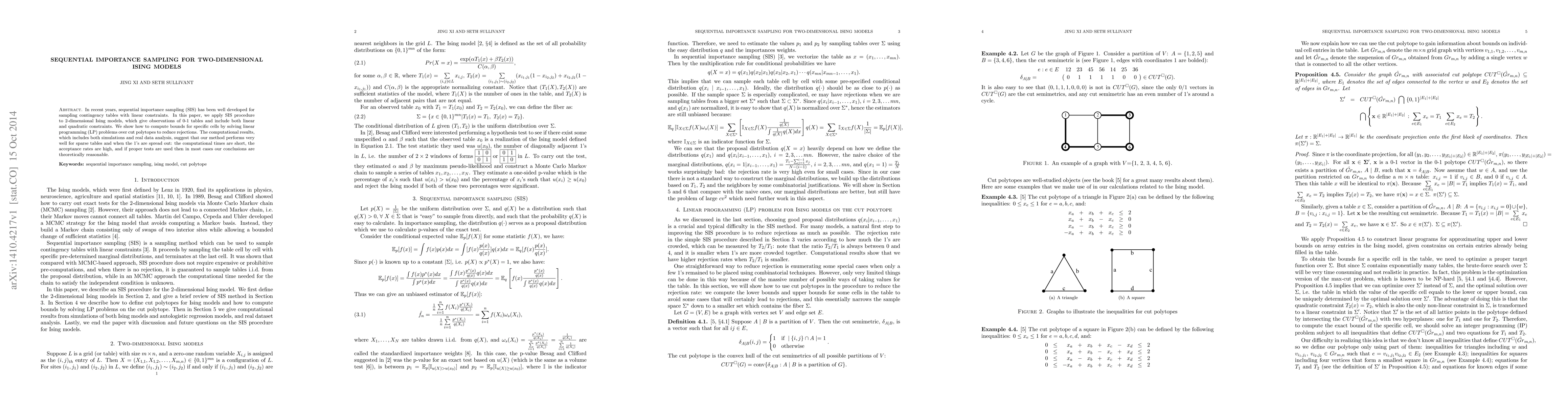 This paper applies sequential importance sampling (SIS) to 2-dimensional Ising models, using linear programming to compute bounds and reduce rejections. The method shows high acceptance rates and short computational times for sparse tables, with theoretically sound conclusions.