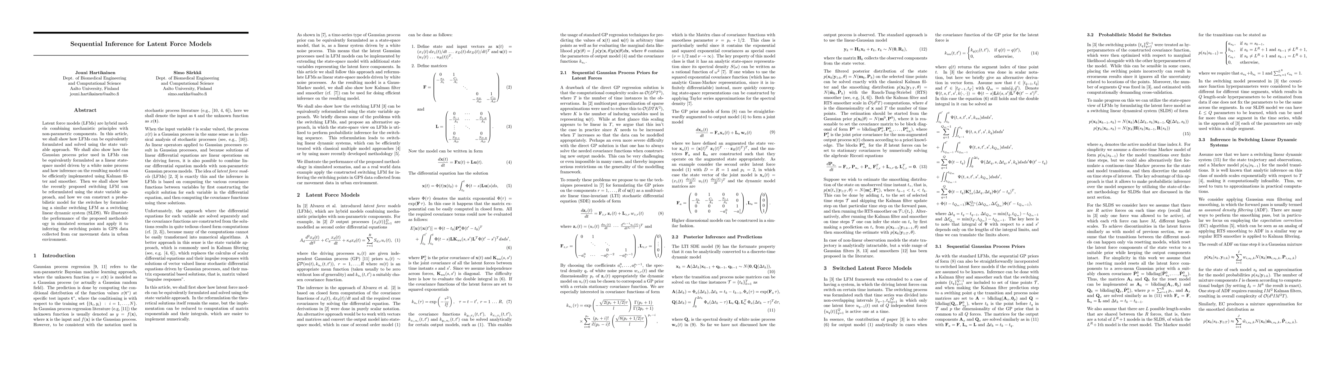 This paper proposes a state variable approach to solve latent force models (LFMs) and reformulates Gaussian process priors as linear state-space models. It demonstrates efficient inference using Kalman filter and smoother, and extends the method to switching LFMs modeled as switching linear dynamic systems, validated through simulations and GPS data analysis.