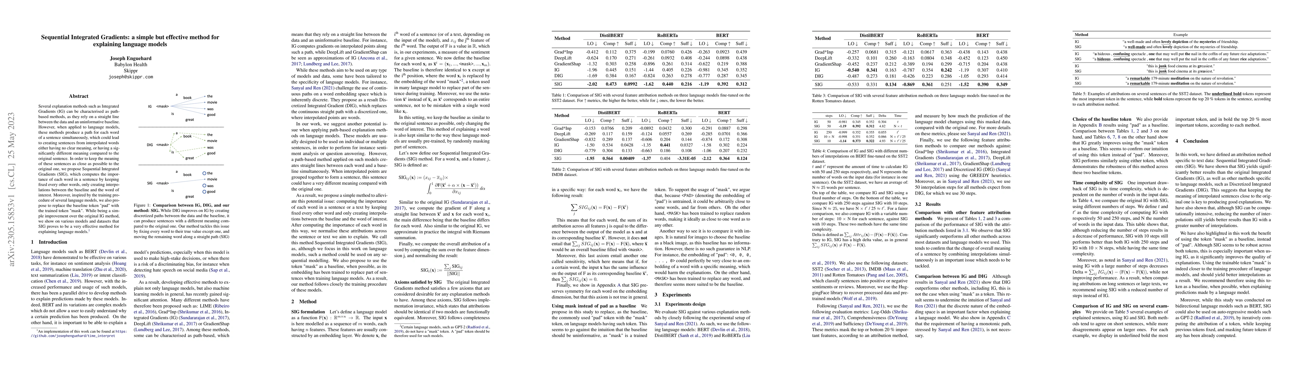 Sequential Integrated Gradients (SIG) improves upon Integrated Gradients by sequentially interpolating only between the baseline and each word of interest, preserving sentence meaning. Replacing the baseline token with a trained "mask" token further enhances its effectiveness in explaining language models.