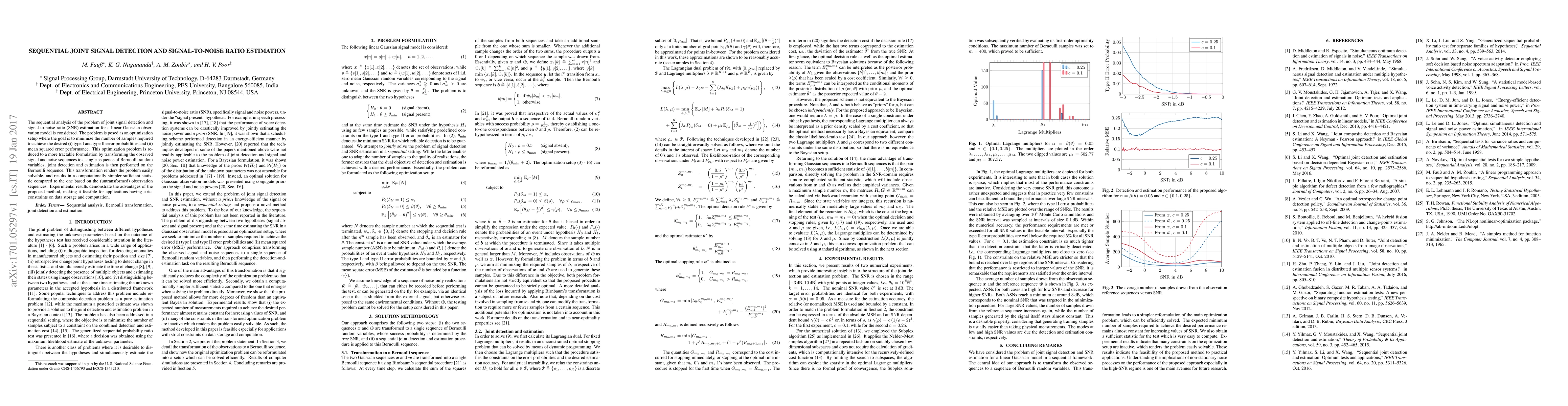 This paper proposes a method for sequential joint signal detection and SNR estimation in a linear Gaussian model, optimizing the number of samples needed while minimizing error probabilities and mean squared error. The transformation to a Bernoulli sequence simplifies computation and results in a more efficient sufficient statistic.