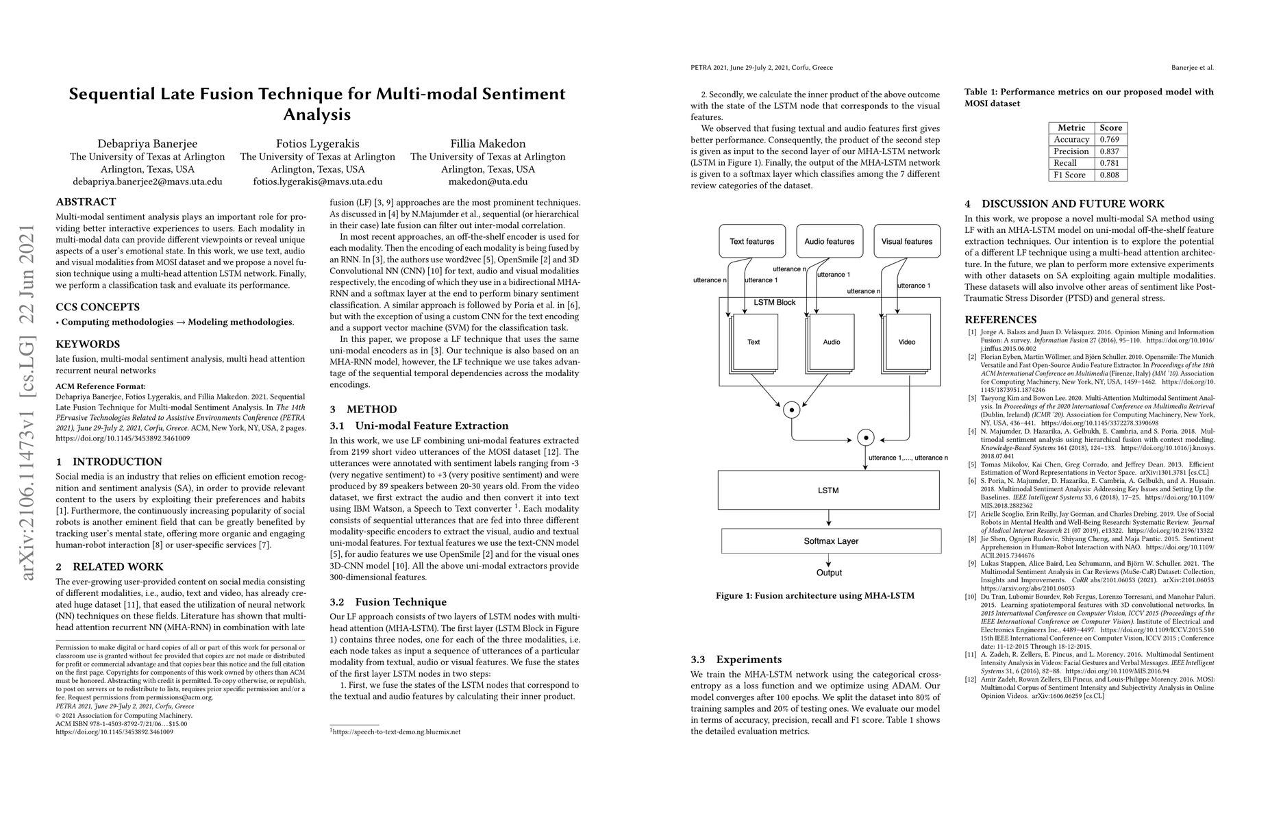 This paper introduces a novel sequential late fusion technique for multi-modal sentiment analysis, combining text, audio, and visual data from the MOSI dataset using a multi-head attention LSTM network, and evaluates its classification performance.