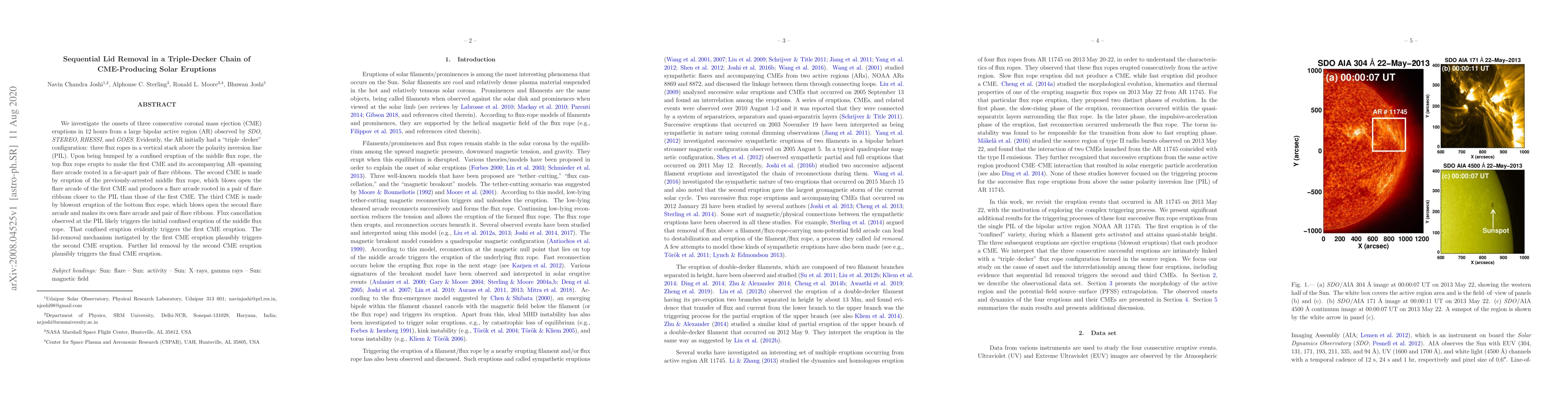 Researchers investigate a sequence of three coronal mass ejection (CME) eruptions from a triple-decker configuration of flux ropes in a solar active region, finding that each eruption triggers the next.