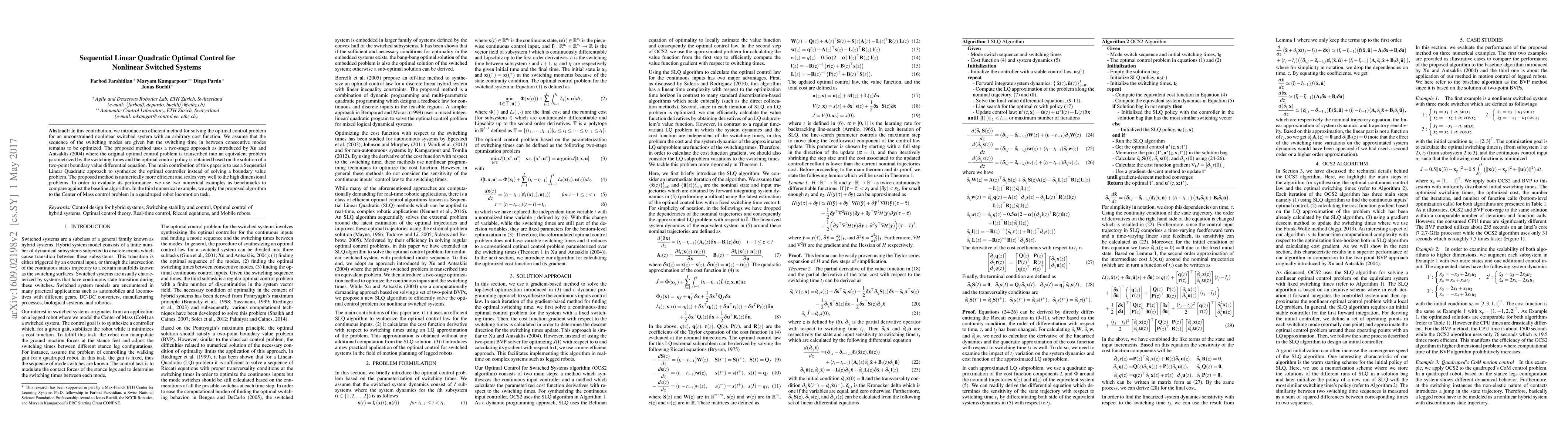 This paper proposes a Sequential Linear Quadratic approach for solving optimal control problems in nonlinear switched systems, optimizing switching times and control policies. The method is numerically efficient and scales well, demonstrated through benchmarks and a quadruped robot locomotion task.