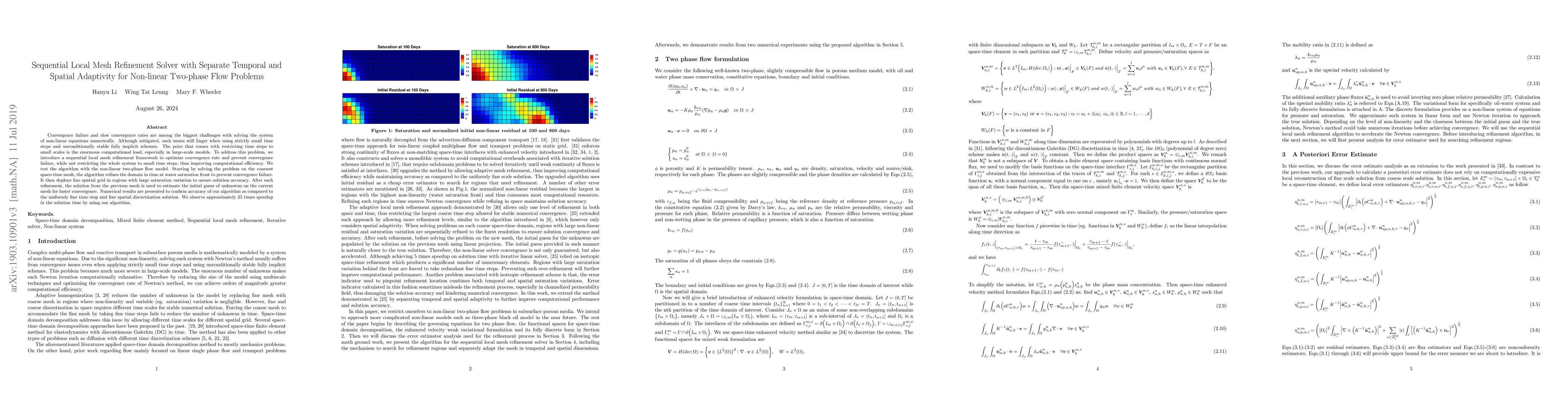 Convergence failure and slow convergence rates are among the biggest challenges with solving the system of non-linear equations numerically. Although mitigated, such issues still linger when using strictly small time steps and unconditionally stable fully implicit schemes. The price that comes with restricting time steps to small scales is the enormous computational load, especially in large-scale models. To address this problem, we introduce a sequential local mesh refinement framework to optimize convergence rate and prevent convergence failure, while not restricting the whole system to small time steps, thus improving computational efficiency. We test the algorithm with the non-linear two-phase flow model. Starting by solving the problem on the coarsest space-time mesh, the algorithm refines the domain in time at water saturation front to prevent convergence failure. It then deploys fine spatial grid in regions with large saturation variation to assure solution accuracy. After each refinement, the solution from the previous mesh is used to estimate the initial guess of unknowns on the current mesh for faster convergence. Numerical results are presented to confirm accuracy of our algorithm as compared to the uniformly fine time step and fine spatial discretization solution. We observe approximately 25 times speedup in the solution time by using our algorithm.