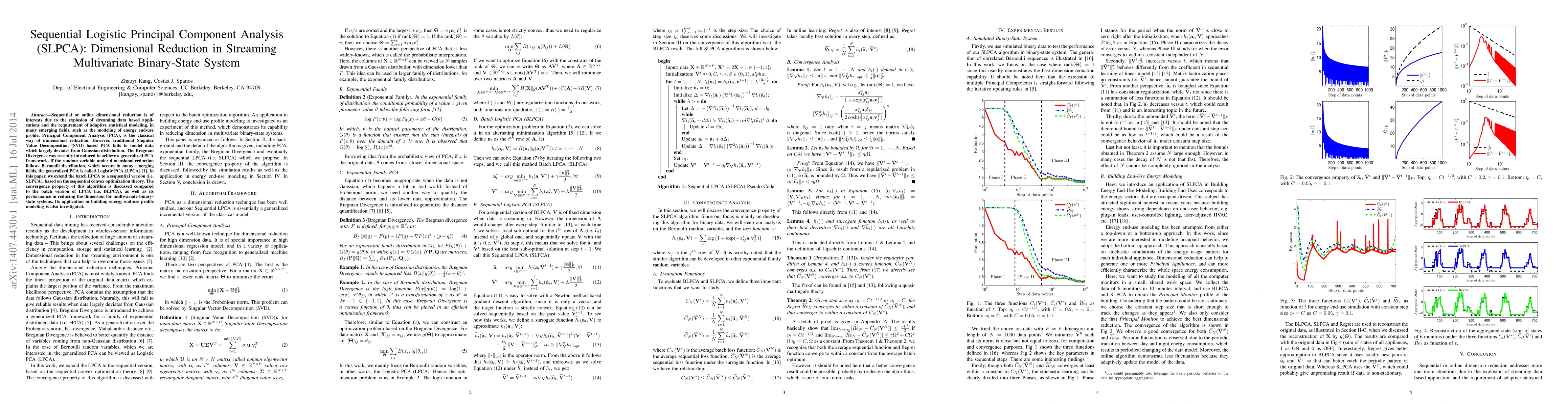 Sequential or online dimensional reduction is of interests due to the explosion of streaming data based applications and the requirement of adaptive statistical modeling, in many emerging fields, such as the modeling of energy end-use profile. Principal Component Analysis (PCA), is the classical way of dimensional reduction. However, traditional Singular Value Decomposition (SVD) based PCA fails to model data which largely deviates from Gaussian distribution. The Bregman Divergence was recently introduced to achieve a generalized PCA framework. If the random variable under dimensional reduction follows Bernoulli distribution, which occurs in many emerging fields, the generalized PCA is called Logistic PCA (LPCA). In this paper, we extend the batch LPCA to a sequential version (i.e. SLPCA), based on the sequential convex optimization theory. The convergence property of this algorithm is discussed compared to the batch version of LPCA (i.e. BLPCA), as well as its performance in reducing the dimension for multivariate binary-state systems. Its application in building energy end-use profile modeling is also investigated.