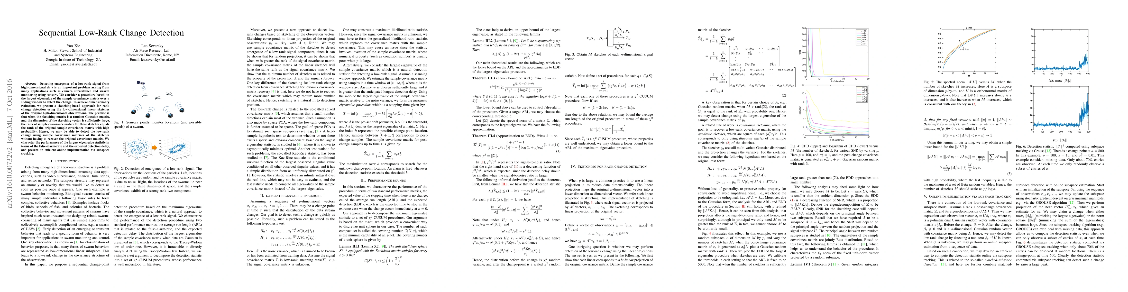 This paper proposes a sketching-based approach for detecting low-rank signal changes in high-dimensional data using the largest eigenvalue of the sample covariance matrix over a sliding window. It employs a random Gaussian sketching matrix to reduce dimensionality and maintain the rank of the covariance matrix, enabling efficient online implementation and performance characterization in terms of false-alarm-rate and detection delay.