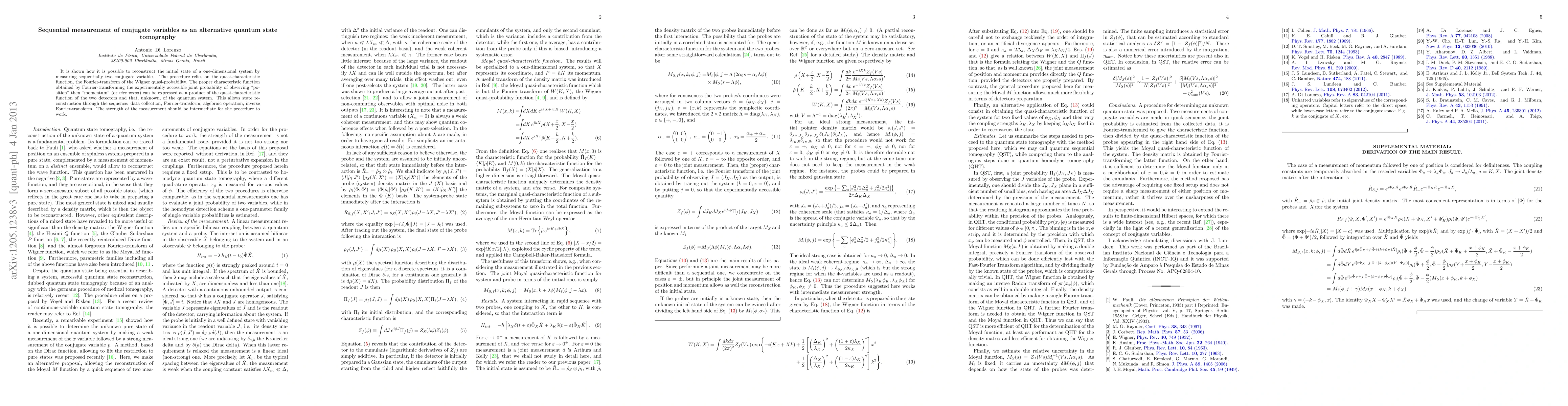 It is shown how it is possible to reconstruct the initial state of a one-dimensional system by measuring sequentially two conjugate variables. The procedure relies on the quasi-characteristic function, the Fourier-transform of the Wigner quasi-probability. The proper characteristic function obtained by Fourier-transforming the experimentally accessible joint probability of observing "position" then "momentum" (or vice versa) can be expressed as a product of the quasi-characteristic function of the two detectors and that, unknown, of the quantum system. This allows state reconstruction through the sequence: data collection, Fourier-transform, algebraic operation, inverse Fourier-transform. The strength of the measurement should be intermediate for the procedure to work.