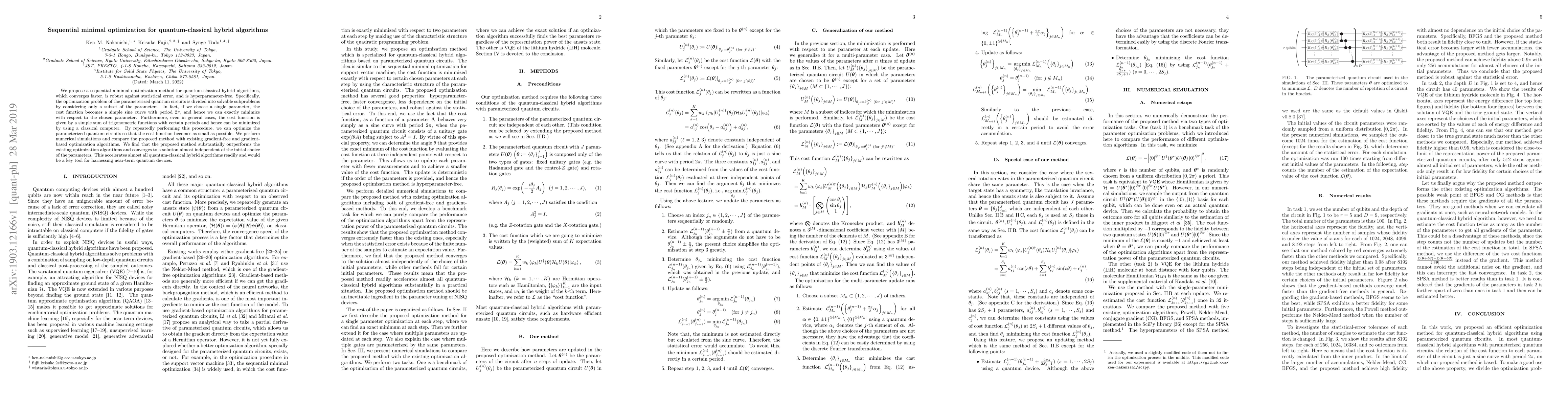 This paper proposes a sequential minimal optimization method for quantum-classical hybrid algorithms that converges faster and is robust against statistical error. The method optimizes parameterized quantum circuits by breaking down the optimization problem into simpler subproblems, achieving significant performance improvements over existing algorithms.