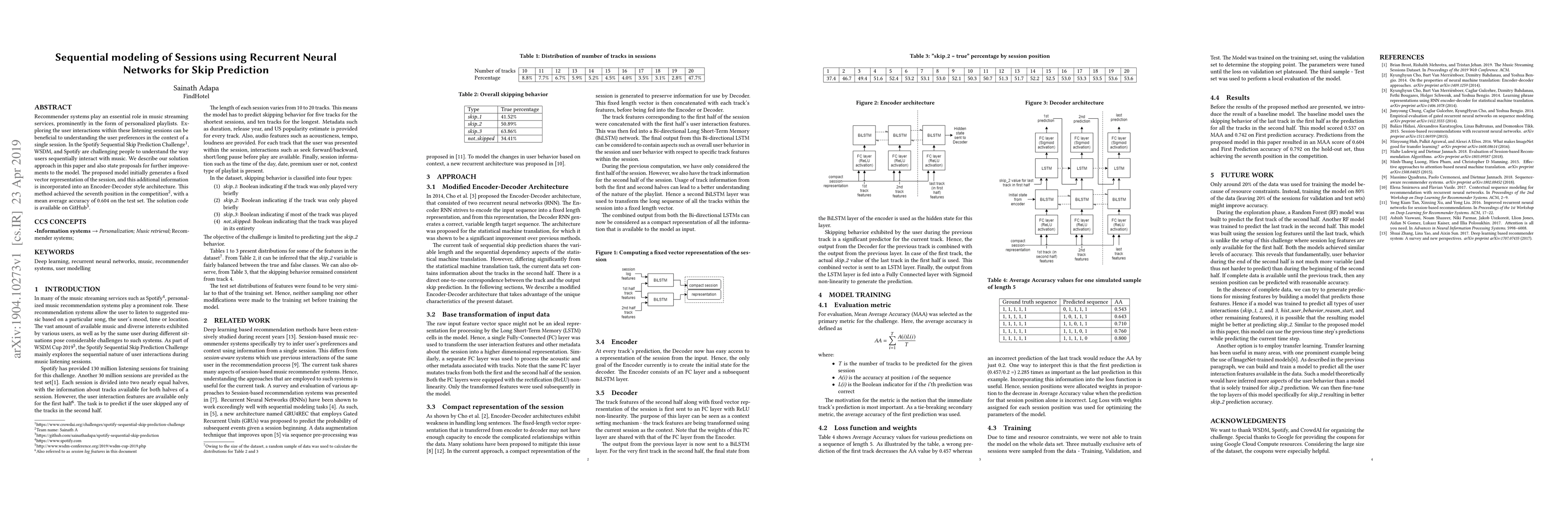 Recommender systems play an essential role in music streaming services, prominently in the form of personalized playlists. Exploring the user interactions within these listening sessions can be beneficial to understanding the user preferences in the context of a single session. In the 'Spotify Sequential Skip Prediction Challenge', WSDM, and Spotify are challenging people to understand the way users sequentially interact with music. We describe our solution approach in this paper and also state proposals for further improvements to the model. The proposed model initially generates a fixed vector representation of the session, and this additional information is incorporated into an Encoder-Decoder style architecture. This method achieved the seventh position in the competition, with a mean average accuracy of 0.604 on the test set. The solution code is available at https://github.com/sainathadapa/spotify-sequential-skip-prediction.