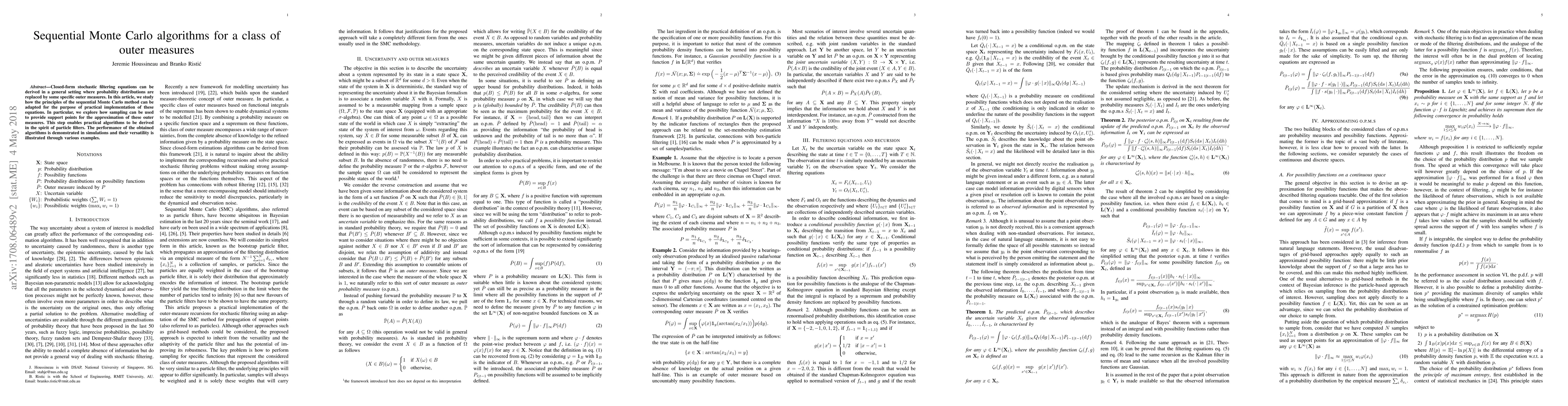 This paper explores adapting sequential Monte Carlo methods for practical implementation of stochastic filtering equations using outer measures instead of probability distributions. It demonstrates the derivation of practical algorithms in the form of particle filters and showcases their performance through simulations and examples.