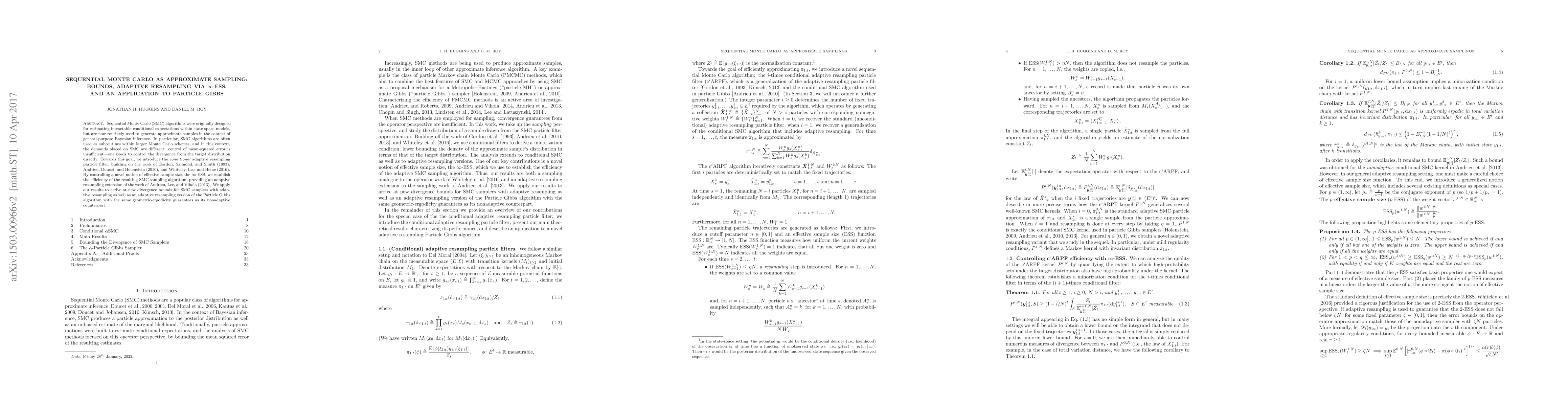 This paper explores the use of Sequential Monte Carlo (SMC) algorithms for approximate sampling in Bayesian inference, introducing a conditional adaptive resampling particle filter. It establishes efficiency bounds using a novel $\infty$-ESS measure, providing adaptive resampling techniques and new divergence bounds for SMC samplers and an adaptive Particle Gibbs algorithm.