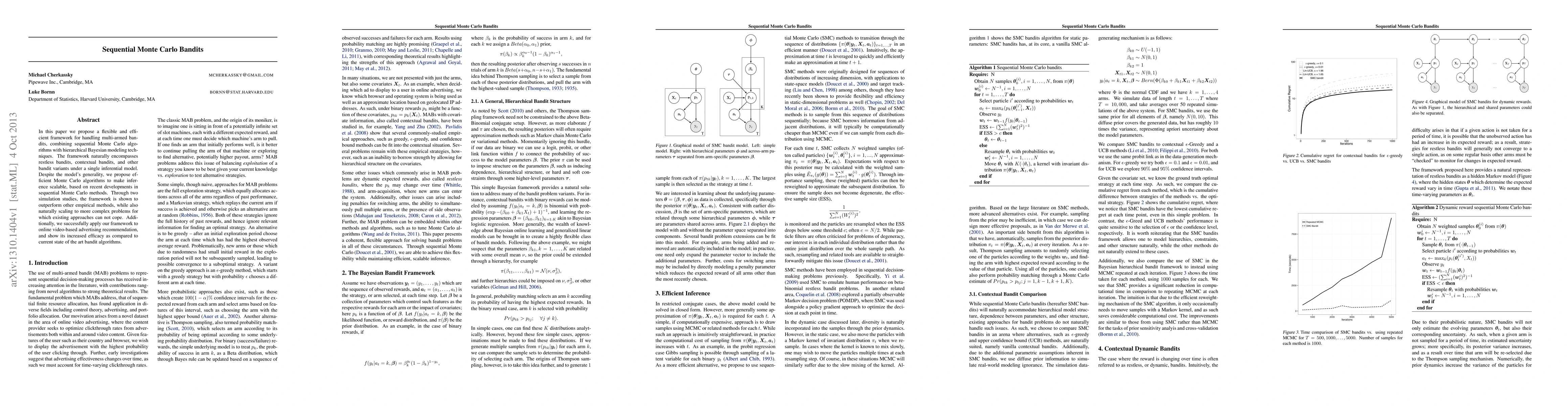 In this paper we propose a flexible and efficient framework for handling multi-armed bandits, combining sequential Monte Carlo algorithms with hierarchical Bayesian modeling techniques. The framework naturally encompasses restless bandits, contextual bandits, and other bandit variants under a single inferential model. Despite the model's generality, we propose efficient Monte Carlo algorithms to make inference scalable, based on recent developments in sequential Monte Carlo methods. Through two simulation studies, the framework is shown to outperform other empirical methods, while also naturally scaling to more complex problems for which existing approaches can not cope. Additionally, we successfully apply our framework to online video-based advertising recommendation, and show its increased efficacy as compared to current state of the art bandit algorithms.