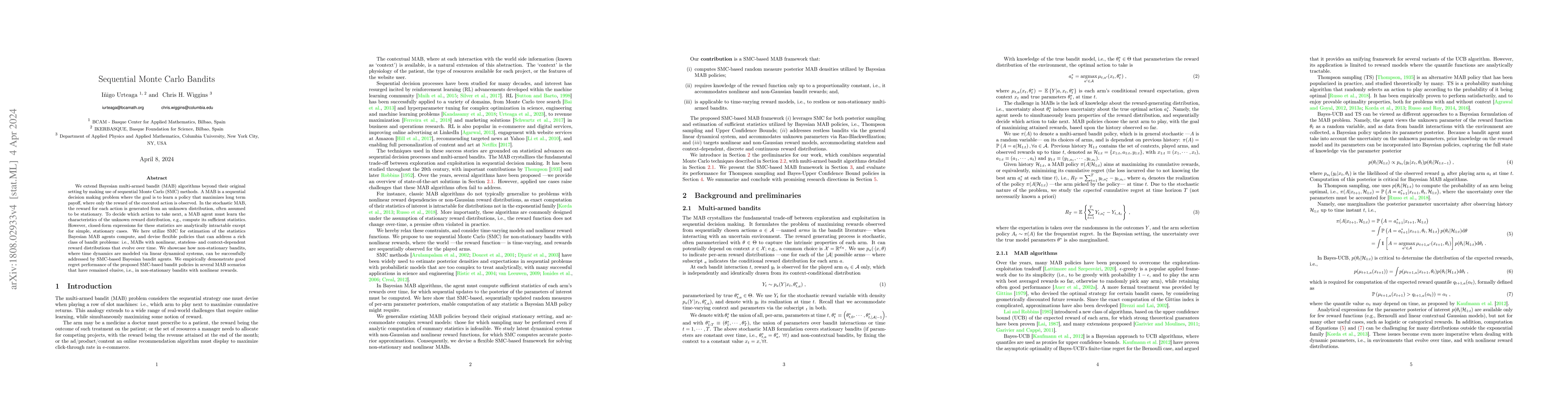 This paper extends Bayesian multi-armed bandit algorithms using sequential Monte Carlo methods to handle non-stationary and nonlinear reward distributions. The proposed SMC-based policies demonstrate effective regret performance in complex, evolving bandit scenarios.