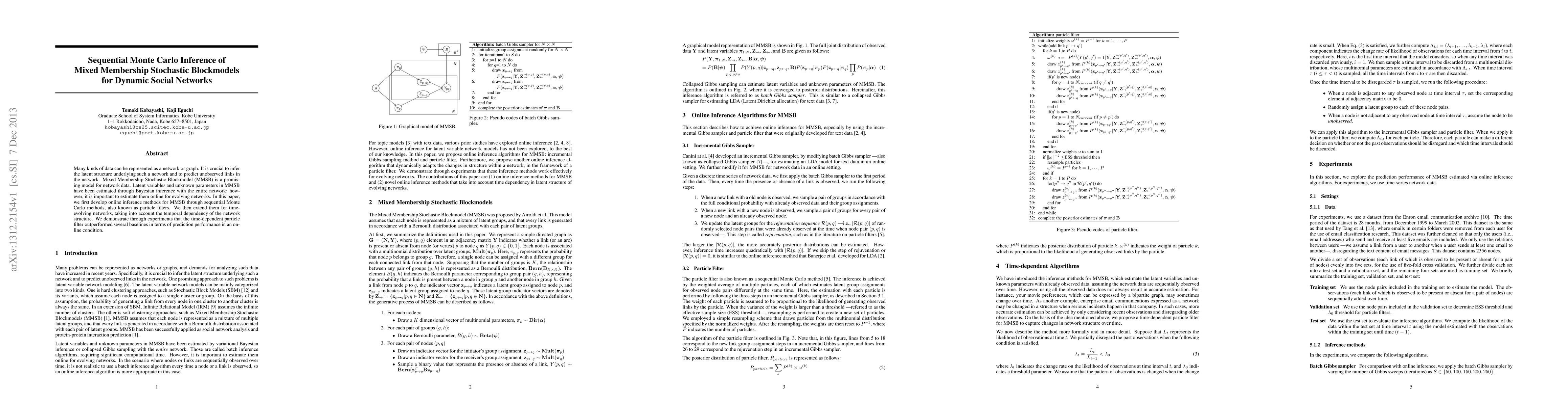 This paper develops online inference methods for Mixed Membership Stochastic Blockmodels (MMSB) using sequential Monte Carlo methods to estimate latent structures and predict unobserved links in evolving social networks. The proposed time-dependent particle filter outperforms baselines in online prediction performance.