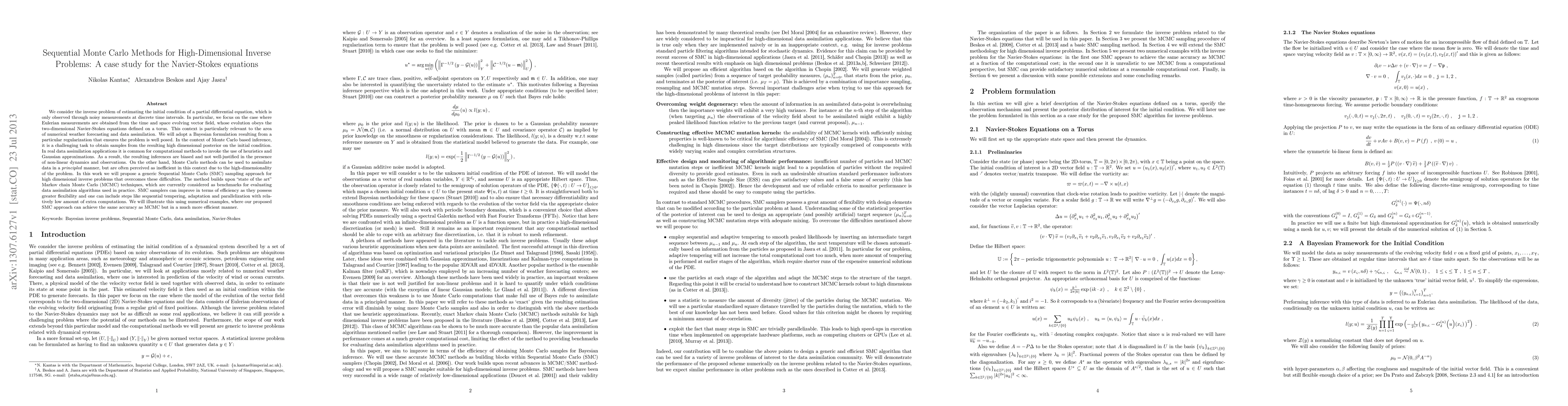This paper proposes a Sequential Monte Carlo (SMC) method to efficiently estimate initial conditions for high-dimensional inverse problems governed by the Navier-Stokes equations. The SMC approach outperforms heuristic methods and Gaussian approximations by providing accurate and unbiased inferences in the context of numerical weather forecasting and data assimilation.