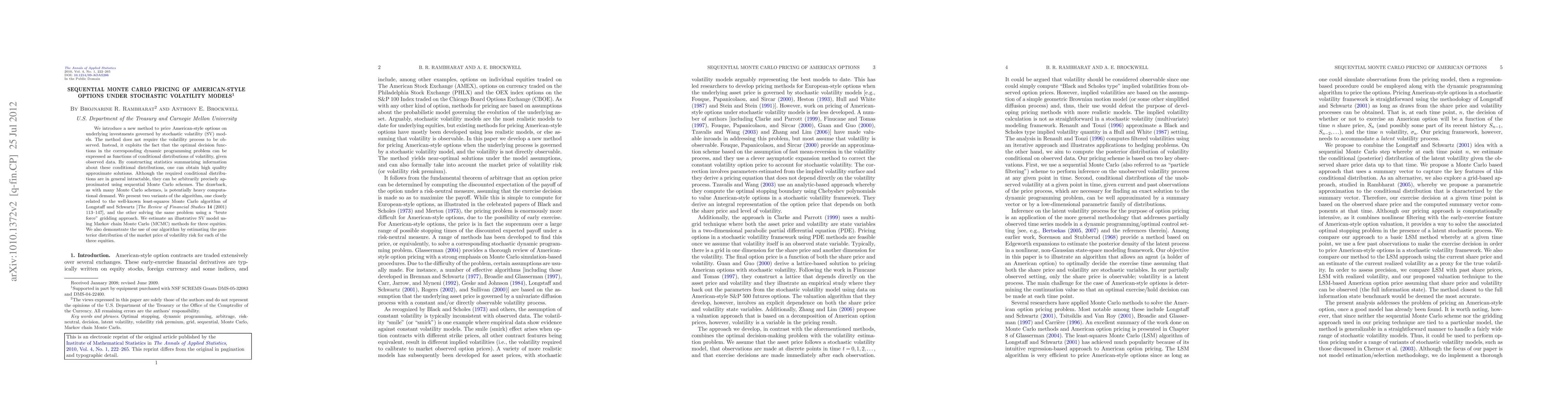 This paper proposes a new method for pricing American-style options under stochastic volatility models using sequential Monte Carlo techniques, which approximates optimal decision functions via conditional distributions of volatility. The method avoids direct observation of the volatility process and demonstrates computational alternatives including a variant related to least-squares Monte Carlo.
