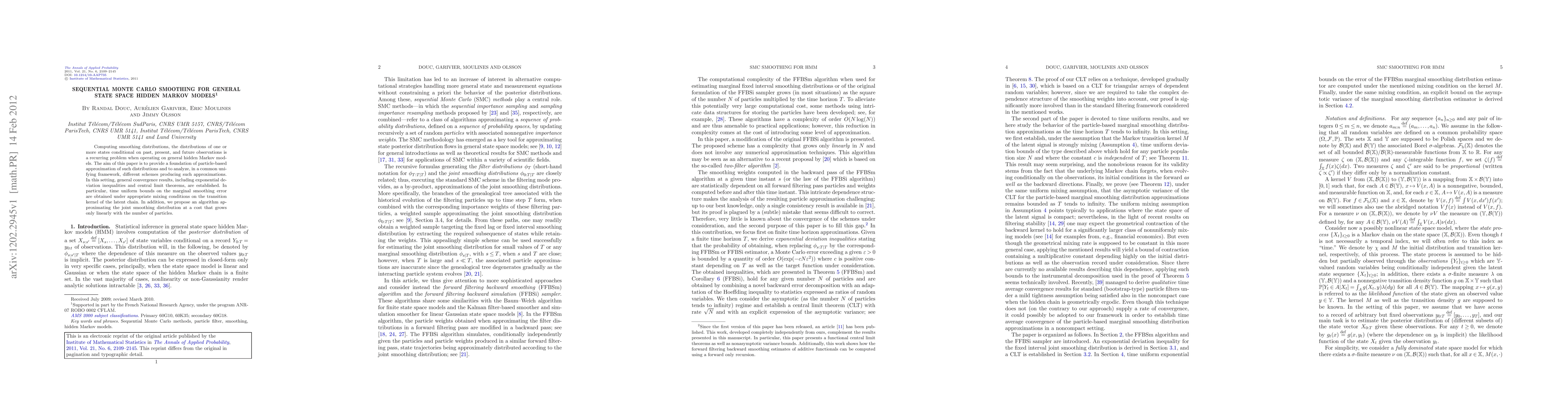 This paper develops a particle-based method for approximating smoothing distributions in general hidden Markov models, providing theoretical convergence results and a scalable algorithm for joint smoothing distribution approximation. The proposed method achieves time uniform bounds on marginal smoothing error under mixing conditions.