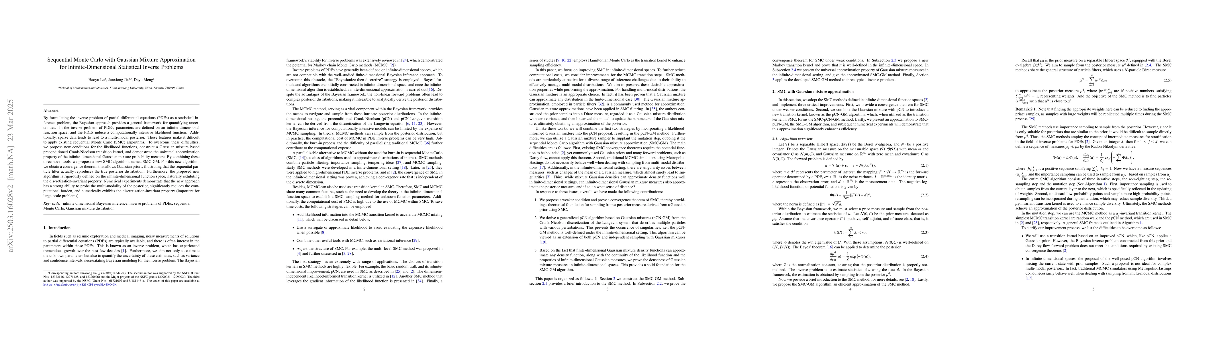 The paper proposes a Sequential Monte Carlo (SMC) algorithm, SMC-GM, for infinite-dimensional statistical inverse problems, combining Gaussian Mixture (GM) approximation with preconditioned Crank-Nicolson transition kernel and demonstrating universal approximation property of infinite-dimensional Gaussian mixture probability measure.