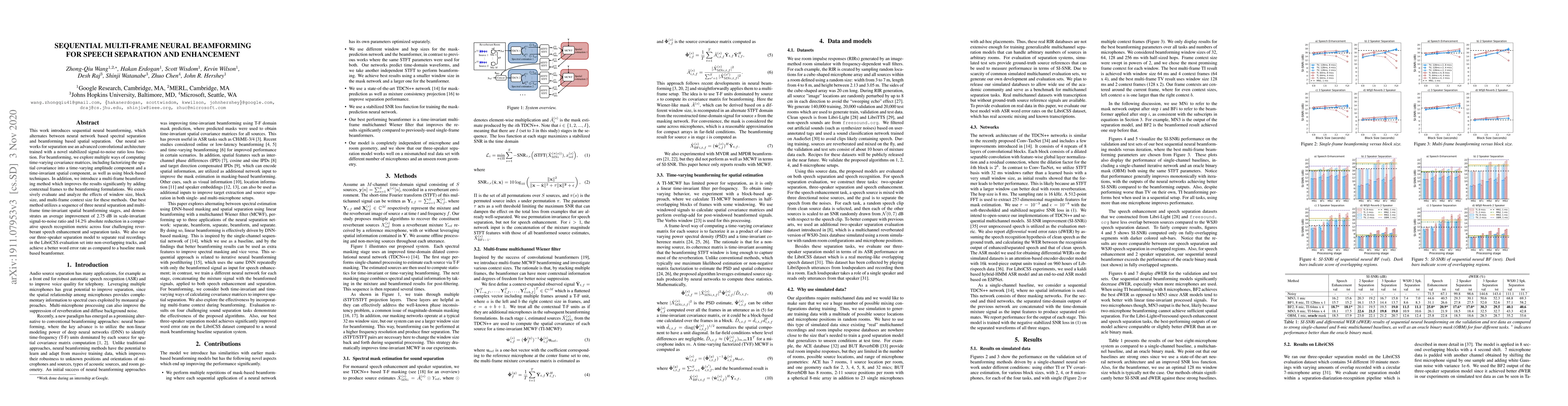 This paper proposes a sequential neural beamforming method for speech separation and enhancement, combining neural network-based spectral separation with advanced beamforming techniques. The method shows significant improvements in signal-to-noise ratio and speech recognition metrics, achieving a 2.75 dB increase and a 14.2% reduction in word error rate compared to baselines.