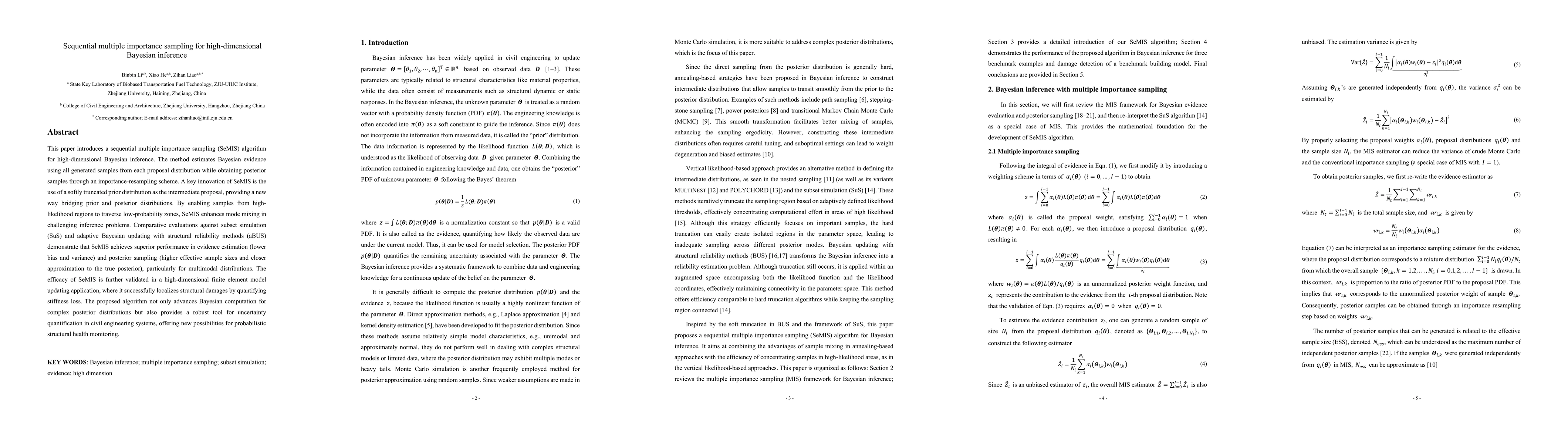 This paper introduces a sequential multiple importance sampling (SeMIS) algorithm for high-dimensional Bayesian inference. The method estimates Bayesian evidence using all generated samples from each proposal distribution while obtaining posterior samples through an importance-resampling scheme. A key innovation of SeMIS is the use of a softly truncated prior distribution as the intermediate proposal, providing a new way bridging prior and posterior distributions. By enabling samples from high-likelihood regions to traverse low-probability zones, SeMIS enhances mode mixing in challenging inference problems. Comparative evaluations against subset simulation (SuS) and adaptive Bayesian updating with structural reliability methods (aBUS) demonstrate that SeMIS achieves superior performance in evidence estimation (lower bias and variance) and posterior sampling (higher effective sample sizes and closer approximation to the true posterior), particularly for multimodal distributions. The efficacy of SeMIS is further validated in a high-dimensional finite element model updating application, where it successfully localizes structural damages by quantifying stiffness loss. The proposed algorithm not only advances Bayesian computation for complex posterior distributions but also provides a robust tool for uncertainty quantification in civil engineering systems, offering new possibilities for probabilistic structural health monitoring.