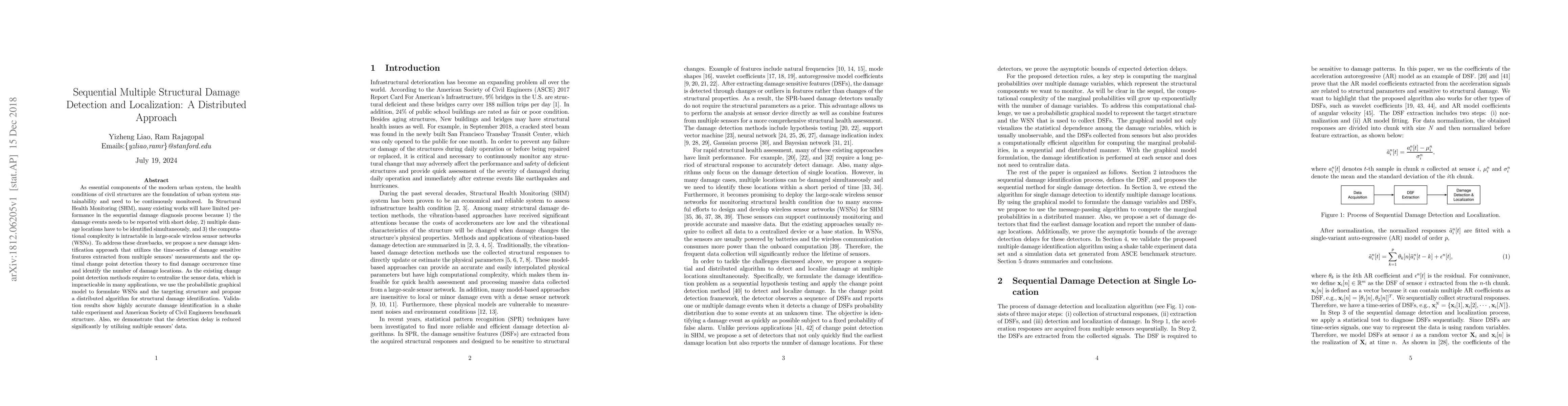 As essential components of the modern urban system, the health conditions of civil structures are the foundation of urban system sustainability and need to be continuously monitored. In Structural Health Monitoring (SHM), many existing works will have limited performance in the sequential damage diagnosis process because 1) the damage events needs to be reported with short delay, 2) multiple damage locations have to be identified simultaneously, and 3) the computational complexity is intractable in large-scale wireless sensor networks (WSNs). To address these drawbacks, we propose a new damage identification approach that utilizes the time-series of damage sensitive features extracted from multiple sensors' measurements and the optimal change point detection theory to find damage occurrence time and identify the number of damage locations. As the existing change point detection methods require to centralize the sensor data, which is impracticable in many applications, we use the probabilistic graphical model to formulate WSNs and the targeting structure and propose a distributed algorithm for structural damage identification. Validation results show highly accurate damage identification in a shake table experiment and American Society of Civil Engineers benchmark structure. Also, we demonstrate that the detection delay is reduced significantly by utilizing multiple sensors' data.