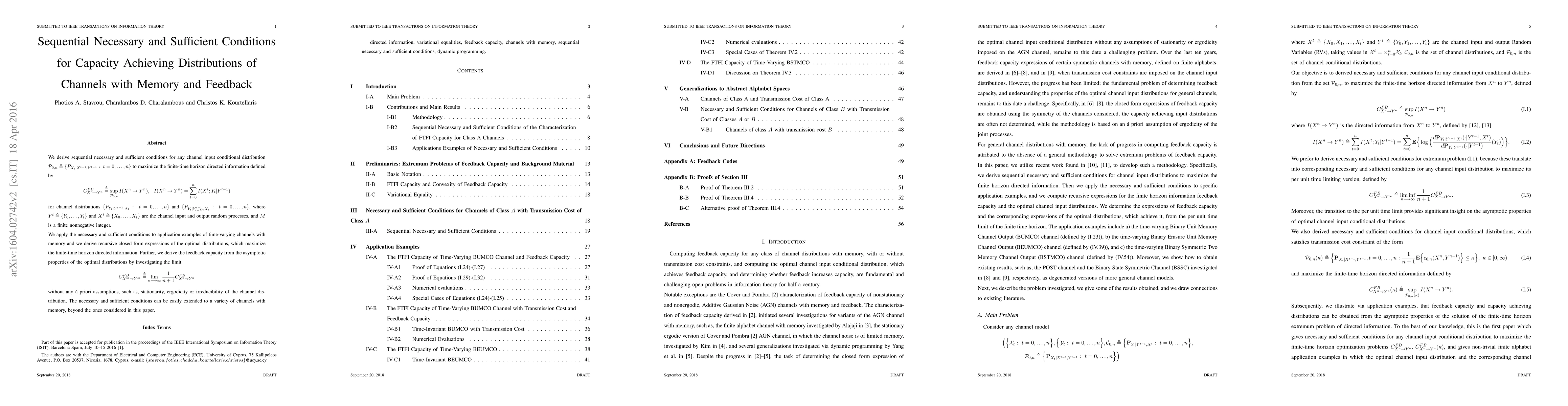 This paper derives sequential necessary and sufficient conditions for input distributions that maximize finite-time directed information in channels with memory and feedback. It provides recursive expressions for optimal distributions and derives the feedback capacity without assumptions like stationarity or ergodicity.