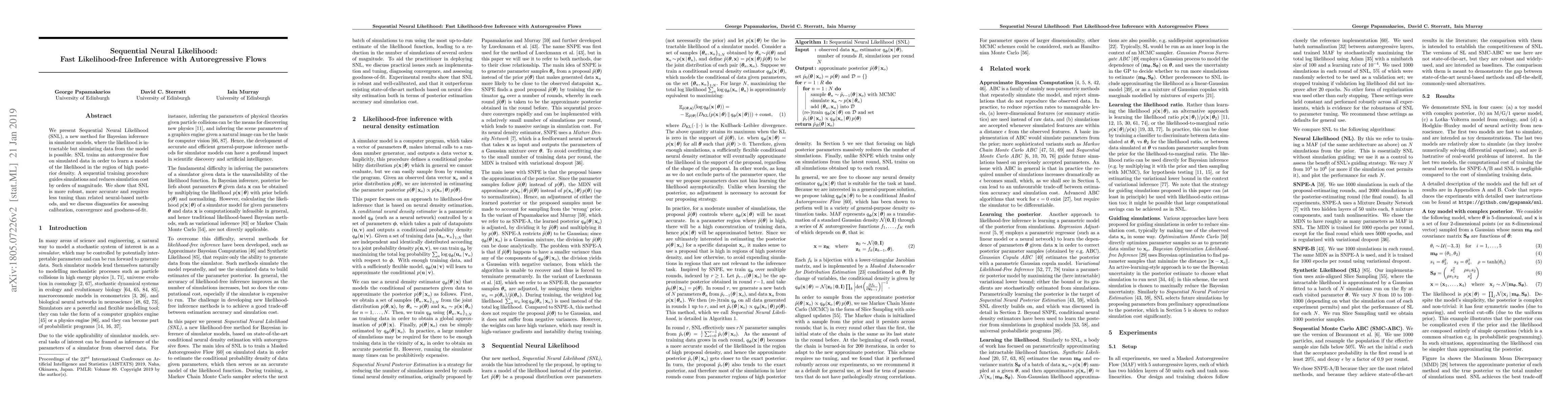 Sequential Neural Likelihood (SNL) employs autoregressive flows to perform efficient Bayesian inference in simulator models where traditional likelihood is intractable. SNL's sequential training significantly reduces simulation costs and demonstrates superior robustness, accuracy, and reduced tuning requirements compared to other neural-based methods.
