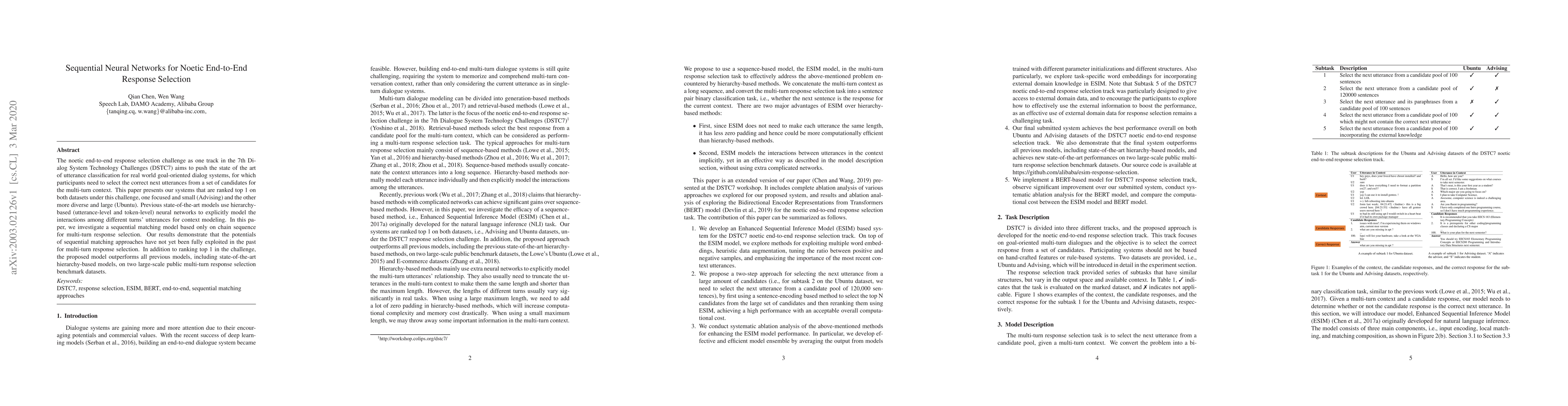 This paper proposes a sequential neural network model for end-to-end response selection in multi-turn dialog systems, achieving top rankings in the DSTC7 challenge. The model outperforms previous hierarchy-based approaches, demonstrating the effectiveness of sequential matching for context modeling in multi-turn response selection.