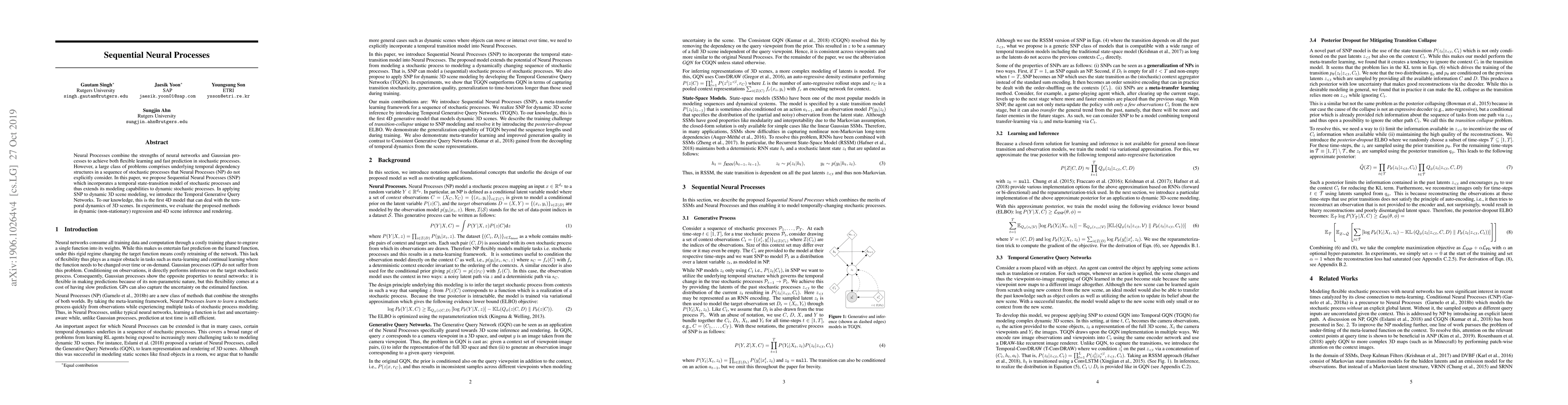 Sequential Neural Processes extend Neural Processes by incorporating temporal state-transition models to handle dynamic stochastic processes, introducing Temporal Generative Query Networks for 4D 3D scene modeling and evaluation in dynamic regression and 4D scene inference.