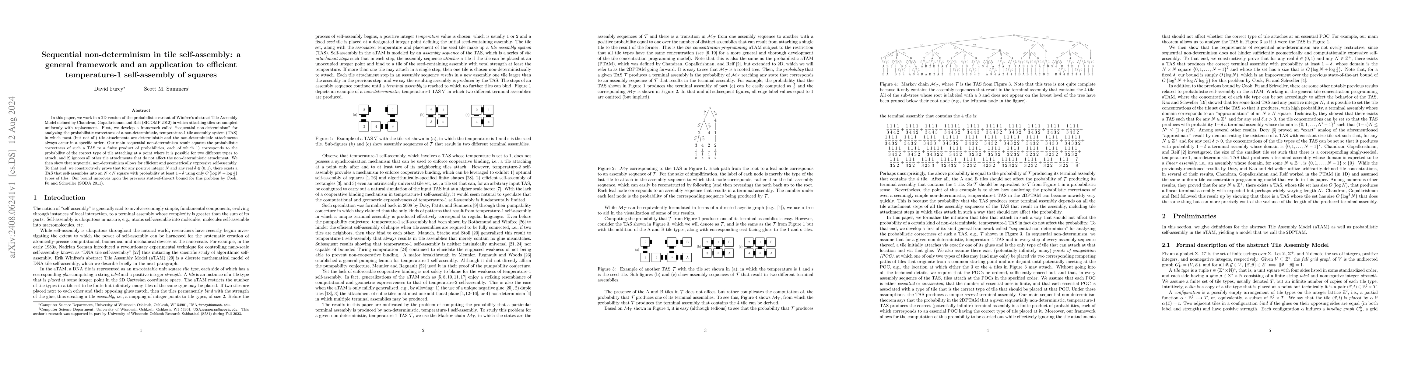 This paper introduces a "sequential non-determinism" framework for analyzing probabilistic tile assembly systems, showing it equates to a finite product of probabilities. The authors apply this framework to achieve efficient self-assembly of $N \times N$ squares with high probability using a minimal number of tile types, improving on prior results.