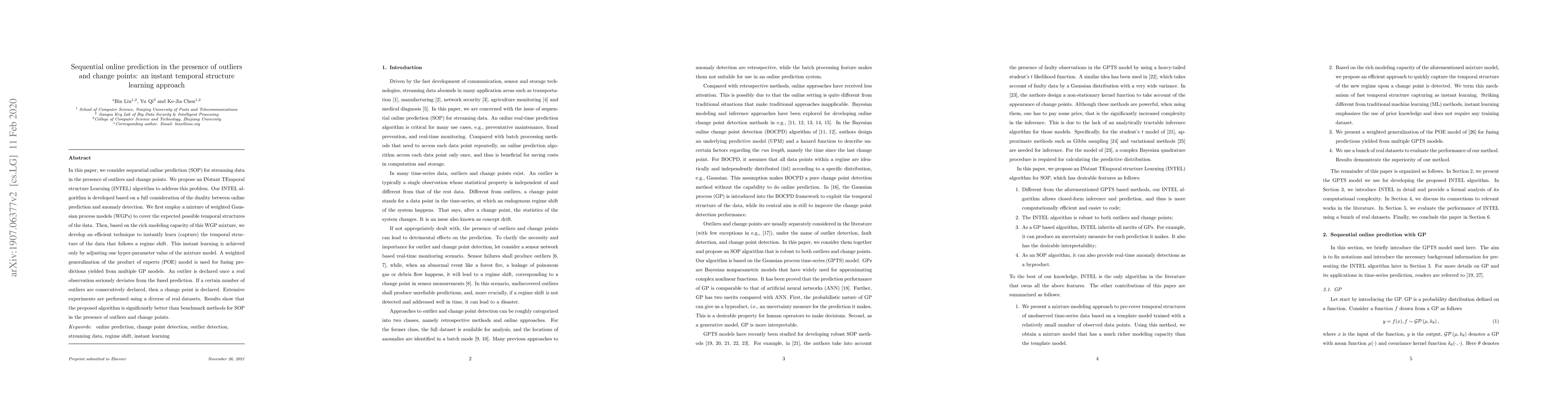 This paper proposes an INTEL algorithm for sequential online prediction in streaming data with outliers and change points, utilizing a mixture of weighted Gaussian process models to capture temporal structures and efficiently detect anomalies and regime shifts. Experiments demonstrate superior performance over benchmark methods.