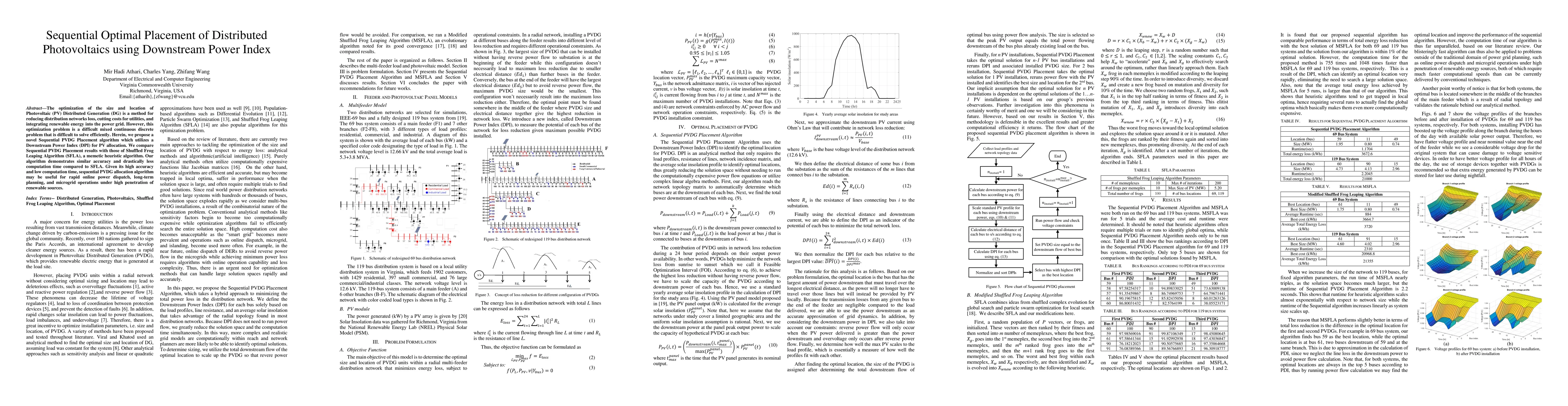 This paper proposes a Sequential PVDG Placement algorithm using a Downstream Power Index to optimize the size and location of distributed photovoltaics, achieving similar accuracy but significantly less computation time compared to the Shuffled Frog Leaping Algorithm. The method is promising for rapid online power dispatch, long-term planning, and microgrid operations with high renewable energy integration.