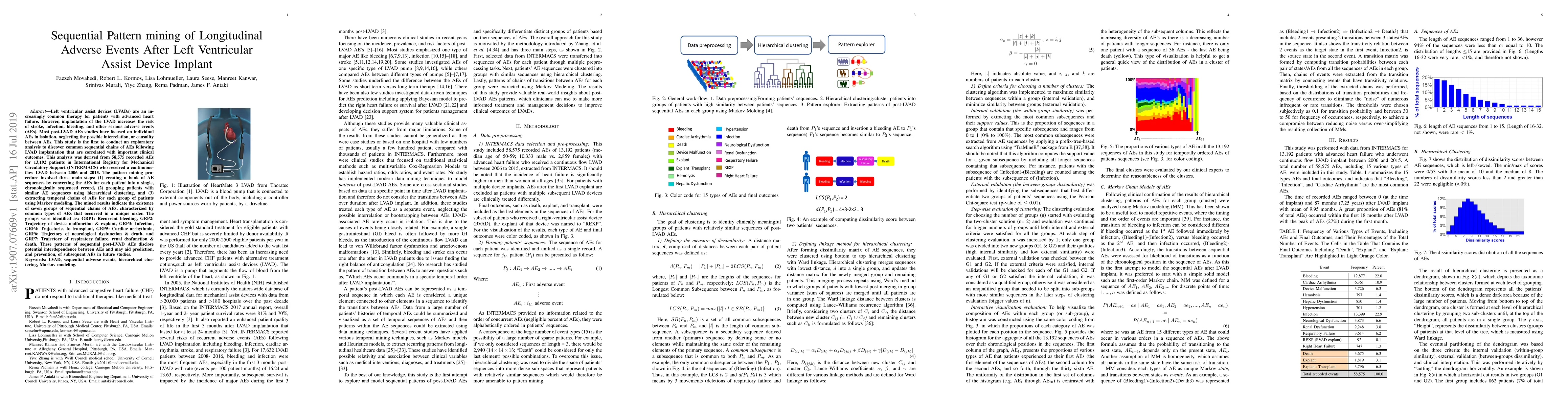 This study mines sequential patterns of longitudinal adverse events following left ventricular assist device (LVAD) implantation, revealing seven distinct groups of AEs with unique temporal chains that correlate with clinical outcomes, potentially aiding in prediction and prevention of future adverse events.