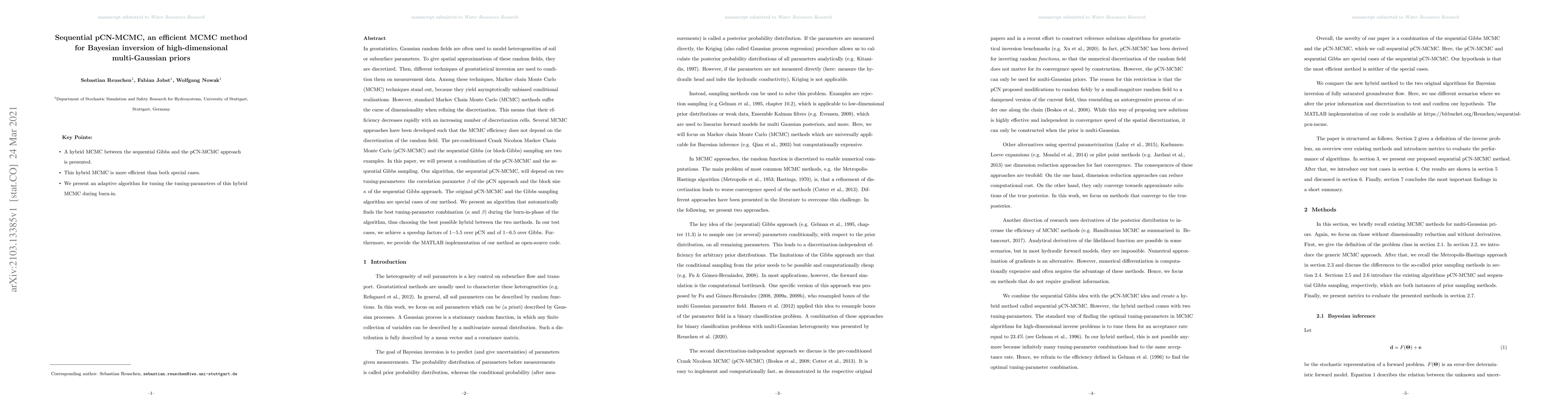 A new MCMC method called sequential pCN-MCMC is introduced for Bayesian inversion of high-dimensional multi-Gaussian priors in geostatistics, achieving speedups of 1-5.5 over standard methods.