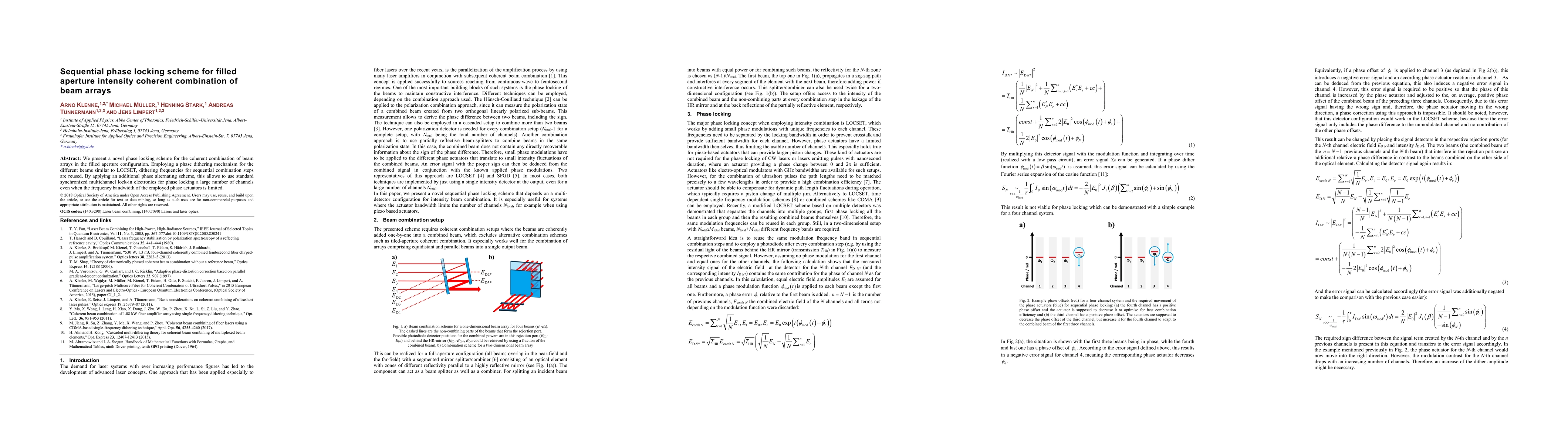 This paper introduces a new method for combining multiple beam arrays coherently using a phase locking scheme. It reuses dithering frequencies and adds a phase alternating scheme, enabling the use of standard electronics for locking a large number of channels, even with limited actuator bandwidth.