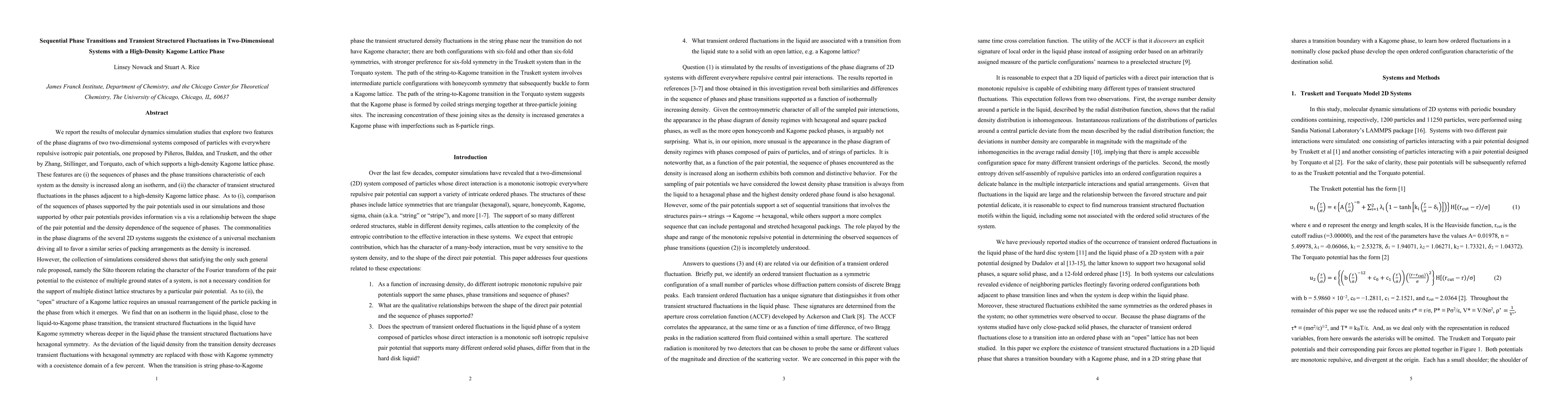 We report studies of the phase diagrams of two two-dimensional systems composed of particles with repulsive pair potentials, each of which supports a high-density Kagome lattice phase. The commonalities in the phase diagrams of the systems we have studied and other 2D systems suggests the existence of a universal mechanism driving all to favor a similar series of packing arrangements as the density is increased, but the simulations considered show that the only such general rule proposed, namely the S\"uto theorem, is not a necessary condition for the support of multiple distinct lattice structures by a particular pair potential. We also find that close to the liquid-to-Kagome phase transition the transient structured fluctuations in the liquid have Kagome symmetry whereas deeper in the liquid phase the fluctuations have hexagonal symmetry. As the deviation of the liquid density from the transition density decreases fluctuations with hexagonal symmetry are replaced with those with Kagome symmetry. When the transition is string phase-to-Kagome phase the transient structured fluctuations in the string phase near the transition have both six-fold and other than six-fold symmetries, with stronger preference for six-fold symmetry in the Truskett system than in the Torquato system. The path of the string-to-Kagome transition in the Truskett system involves intermediate honeycomb configurations that subsequently buckle to form a Kagome lattice. The path of the string-to-Kagome transition in the Torquato system suggests that the Kagome phase is formed by coiled strings merging together; increasing density generates a Kagome phase with imperfections such as 8-particle rings.