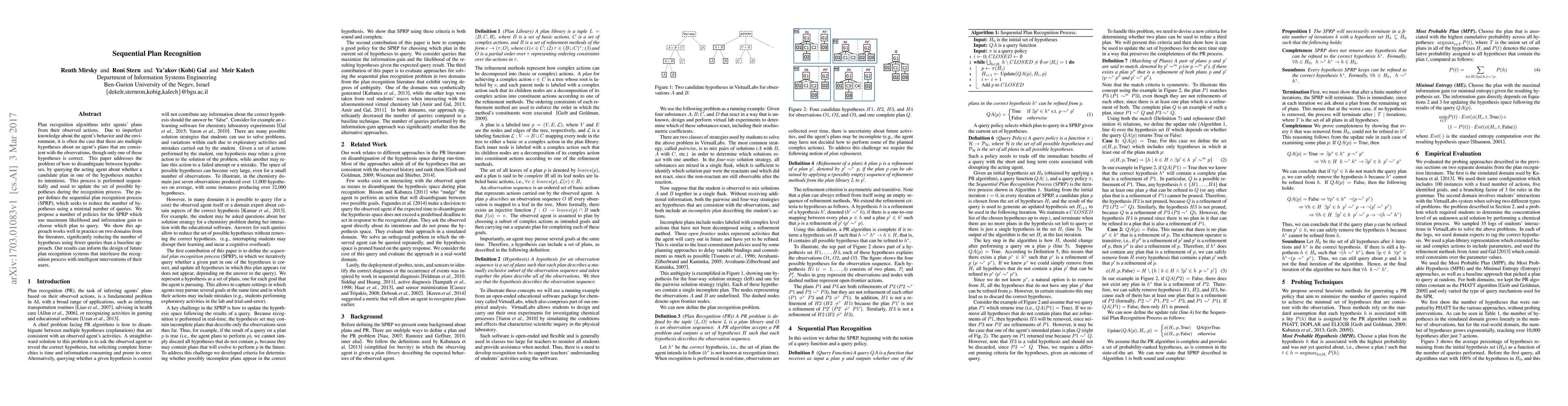 This paper proposes a sequential plan recognition process (SPRP) to disambiguate hypotheses about agents' plans by querying the agent, aiming to reduce the number of hypotheses with minimal queries. The study introduces policies based on maximum likelihood and information gain, demonstrating effective performance in practice and fewer queries compared to baseline methods.