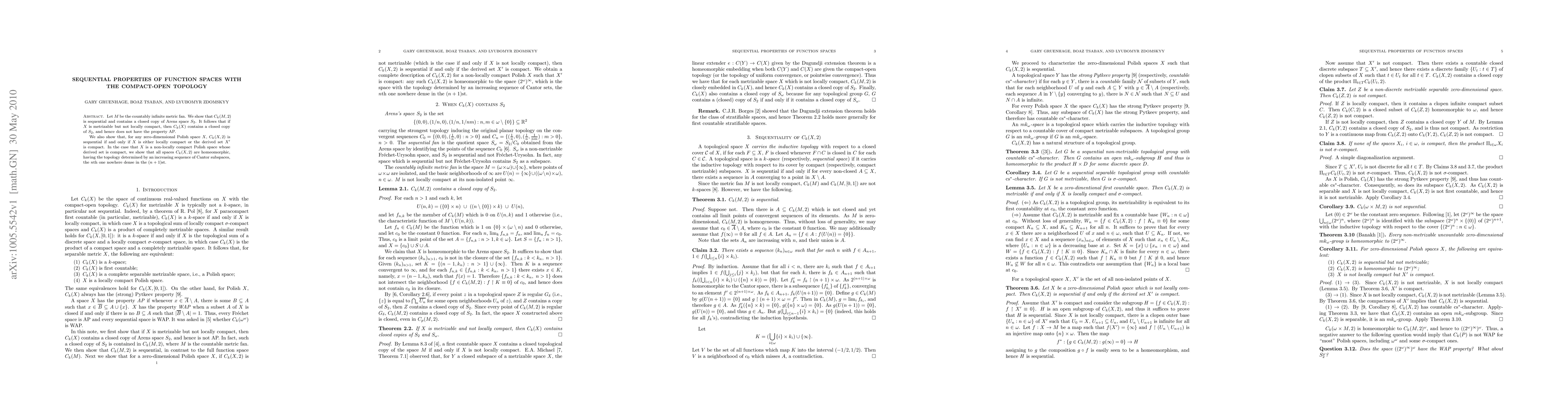 Let M be the countably infinite metric fan. We show that C_k(M,2) is sequential and contains a closed copy of Arens space S_2. It follows that if X is metrizable but not locally compact, then C_k(X) contains a closed copy of S_2, and hence does not have the property AP. We also show that, for any zero-dimensional Polish space X, C_k(X,2) is sequential if and only if X is either locally compact or the derived set X' is compact. In the case that X is a non-locally compact Polish space whose derived set is compact, we show that all spaces C_k(X, 2) are homeomorphic, having the topology determined by an increasing sequence of Cantor subspaces, the n-th one nowhere dense in the (n+1)-st.