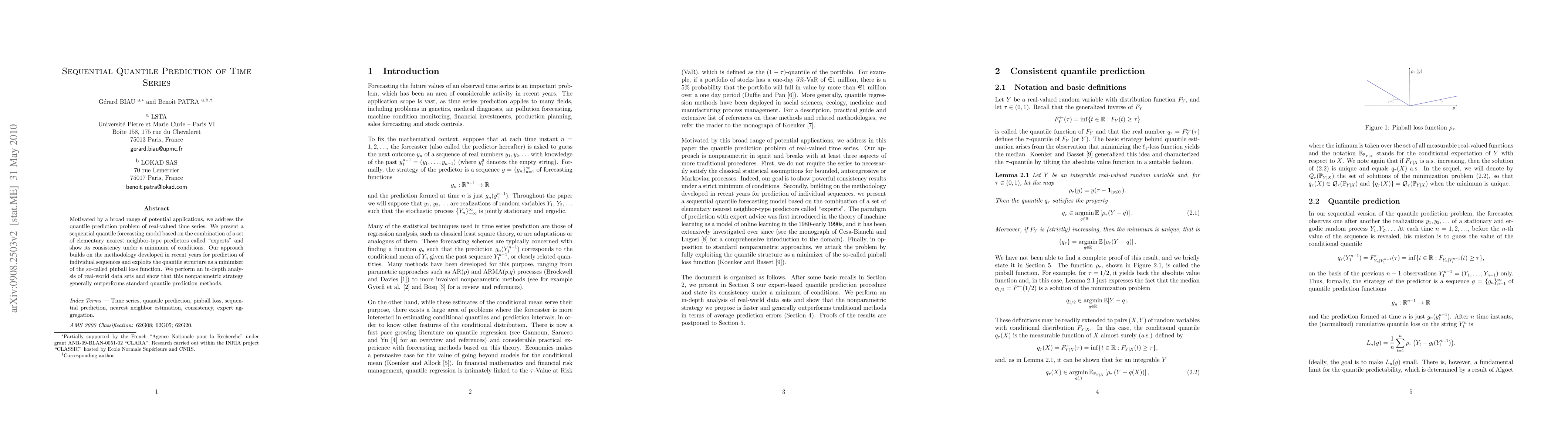 Motivated by a broad range of potential applications, we address the quantile prediction problem of real-valued time series. We present a sequential quantile forecasting model based on the combination of a set of elementary nearest neighbor-type predictors called "experts" and show its consistency under a minimum of conditions. Our approach builds on the methodology developed in recent years for prediction of individual sequences and exploits the quantile structure as a minimizer of the so-called pinball loss function. We perform an in-depth analysis of real-world data sets and show that this nonparametric strategy generally outperforms standard quantile prediction methods