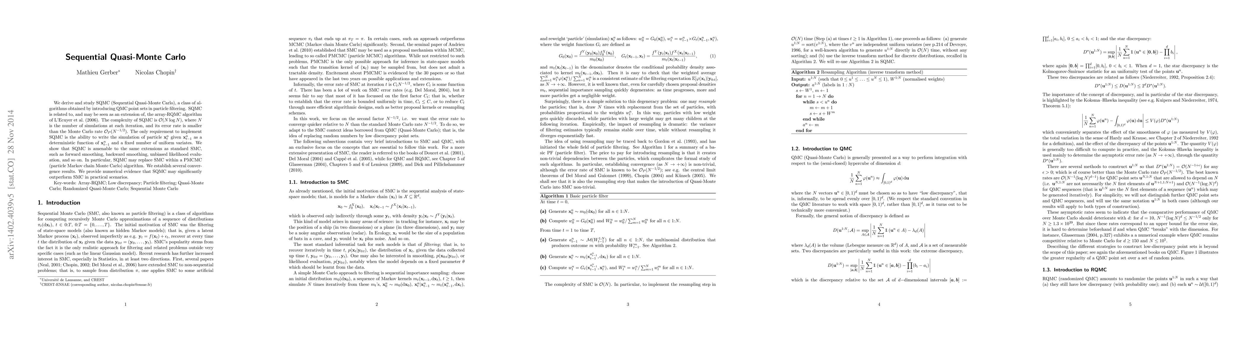Sequential Quasi-Monte Carlo (SQMC) extends particle filtering by incorporating Quasi-Monte Carlo point sets, achieving $O(N \log N)$ complexity and lower error rates than standard Monte Carlo methods. SQMC can replace standard Sequential Monte Carlo (SMC) in particle Markov chain Monte Carlo (PMCMC) algorithms and shows potential for superior performance in practical applications.