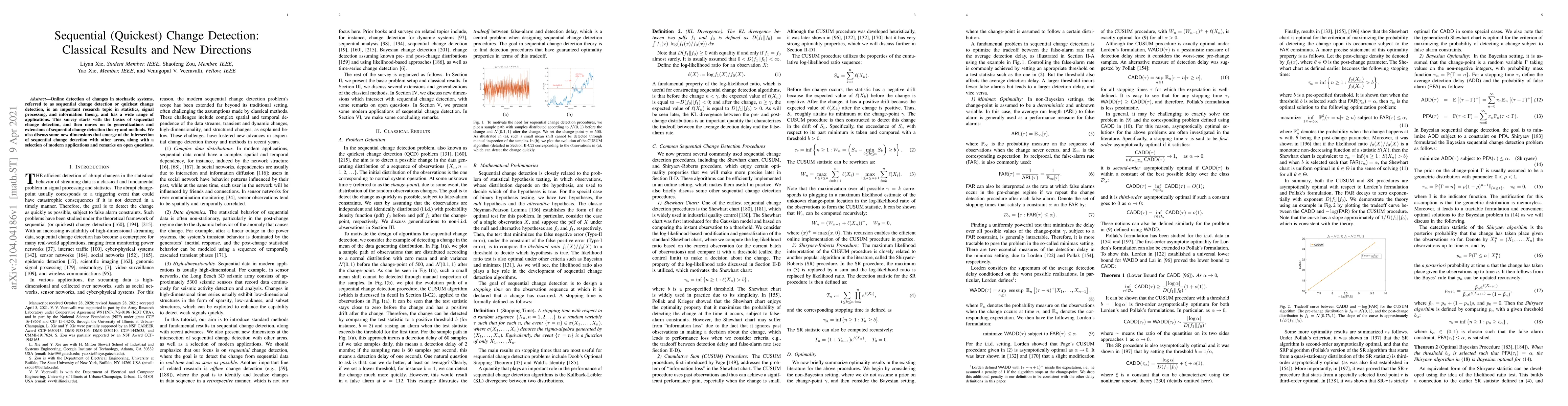 This paper surveys classical results and new directions in sequential change detection, emphasizing its importance in statistics, signal processing, and information theory, and explores its modern applications and open questions.