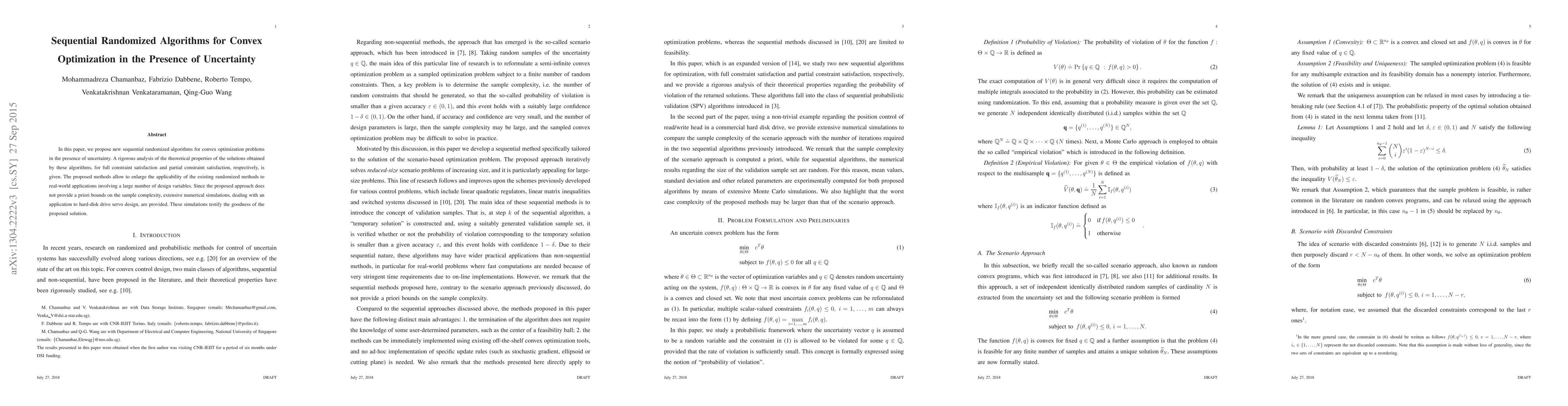 In this paper, we propose new sequential randomized algorithms for convex optimization problems in the presence of uncertainty. A rigorous analysis of the theoretical properties of the solutions obtained by these algorithms, for full constraint satisfaction and partial constraint satisfaction, respectively, is given. The proposed methods allow to enlarge the applicability of the existing randomized methods to real-world applications involving a large number of design variables. Since the proposed approach does not provide a priori bounds on the sample complexity, extensive numerical simulations, dealing with an application to hard-disk drive servo design, are provided. These simulations testify the goodness of the proposed solution.