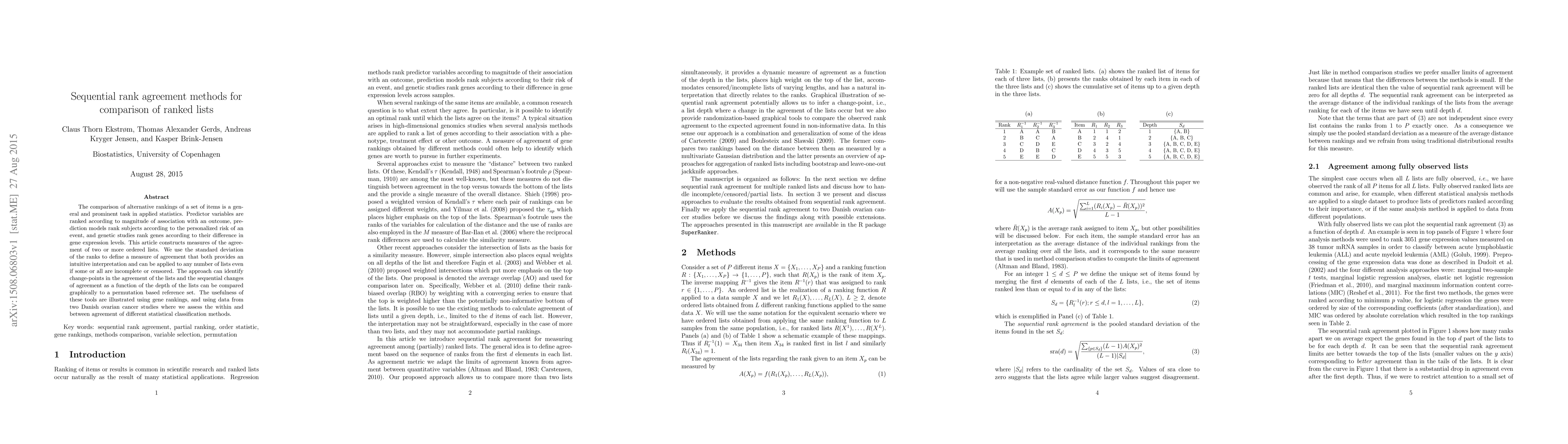 This paper develops sequential rank agreement methods to compare multiple ranked lists, using the standard deviation of ranks for intuitive and broadly applicable agreement measures. It demonstrates the method's utility through gene rankings and ovarian cancer study data.