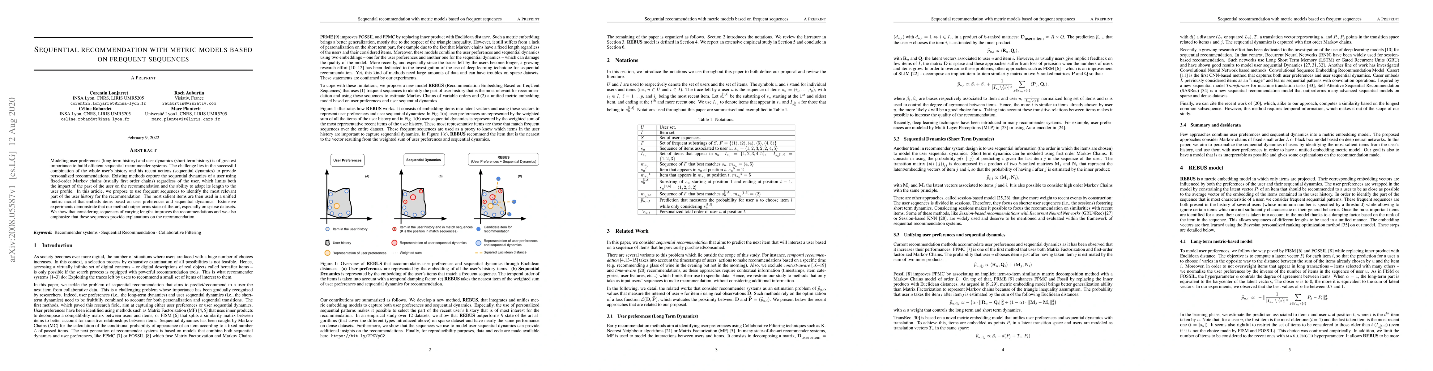This paper proposes a novel sequential recommendation method using metric models based on frequent sequences to better capture both long-term user preferences and short-term dynamics. The approach outperforms existing methods, especially on sparse datasets, by adapting the length of sequences to individual user profiles and providing interpretable recommendations.