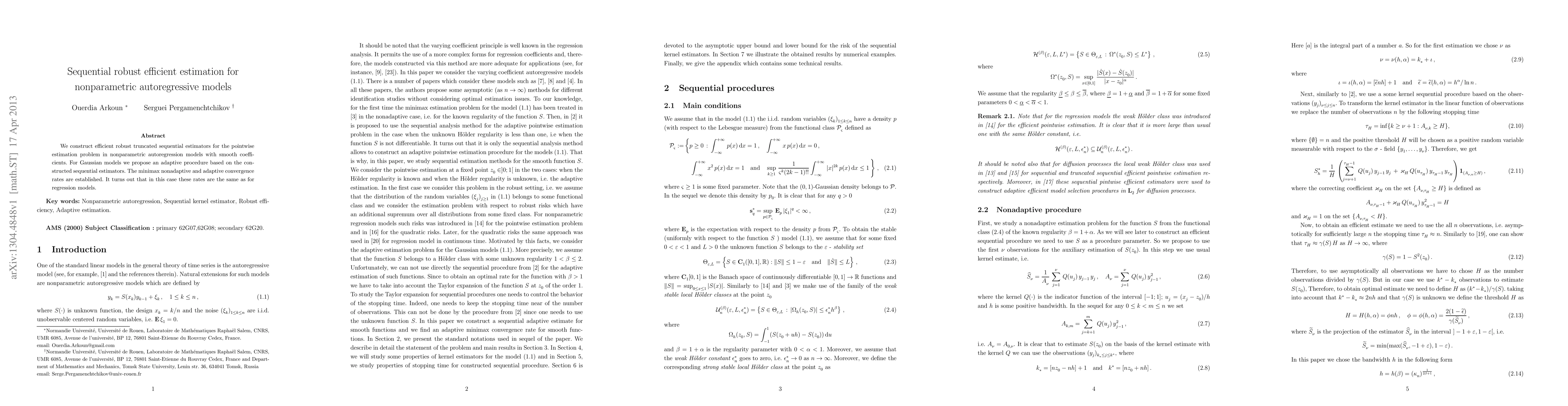 We construct efficient robust truncated sequential estimators for the pointwise estimation problem in nonparametric autoregression models with smooth coefficients. For Gaussian models we propose an adaptive procedure based on the constructed sequential estimators. The minimax nonadaptive and adaptive convergence rates are established. It turns out that in this case these rates are the same as for regression models.